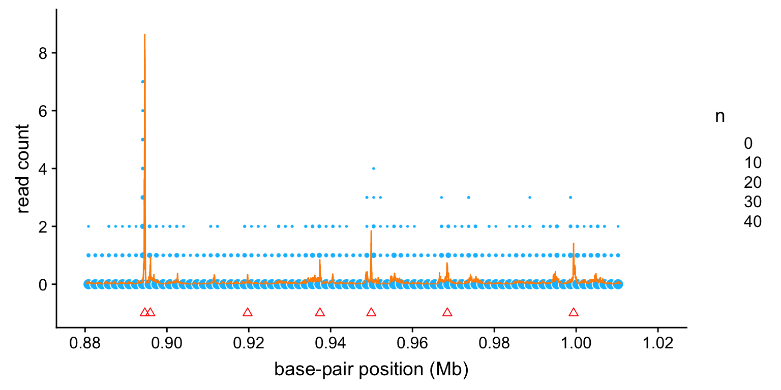 create.chipseq.plot(bppos/1e6,counts,res$est,(peaks$start + peaks$end)/2e6,