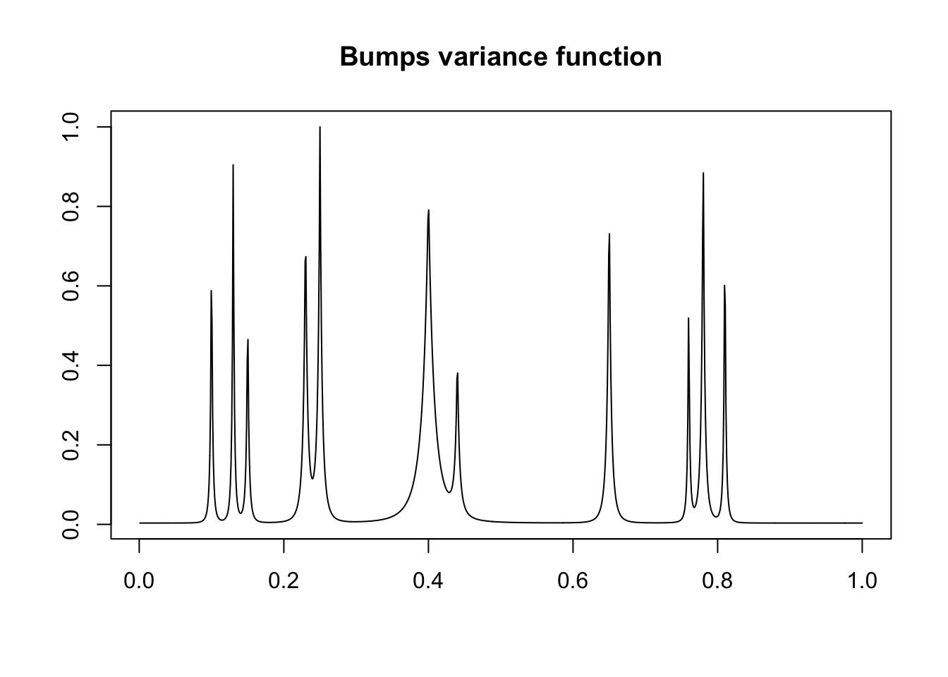 plot(t,var4,xlab = "",ylab = "",type = "l",main = "Bumps variance function")