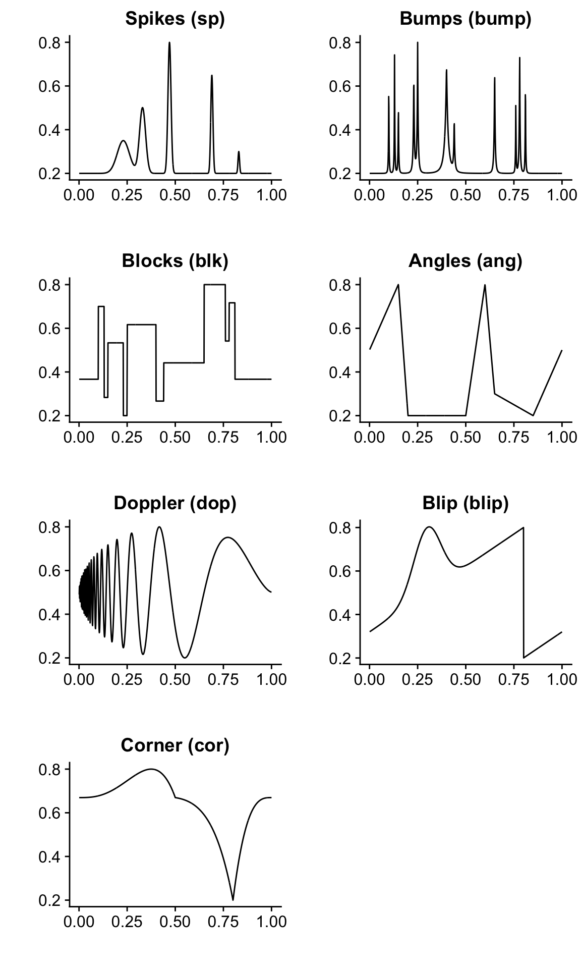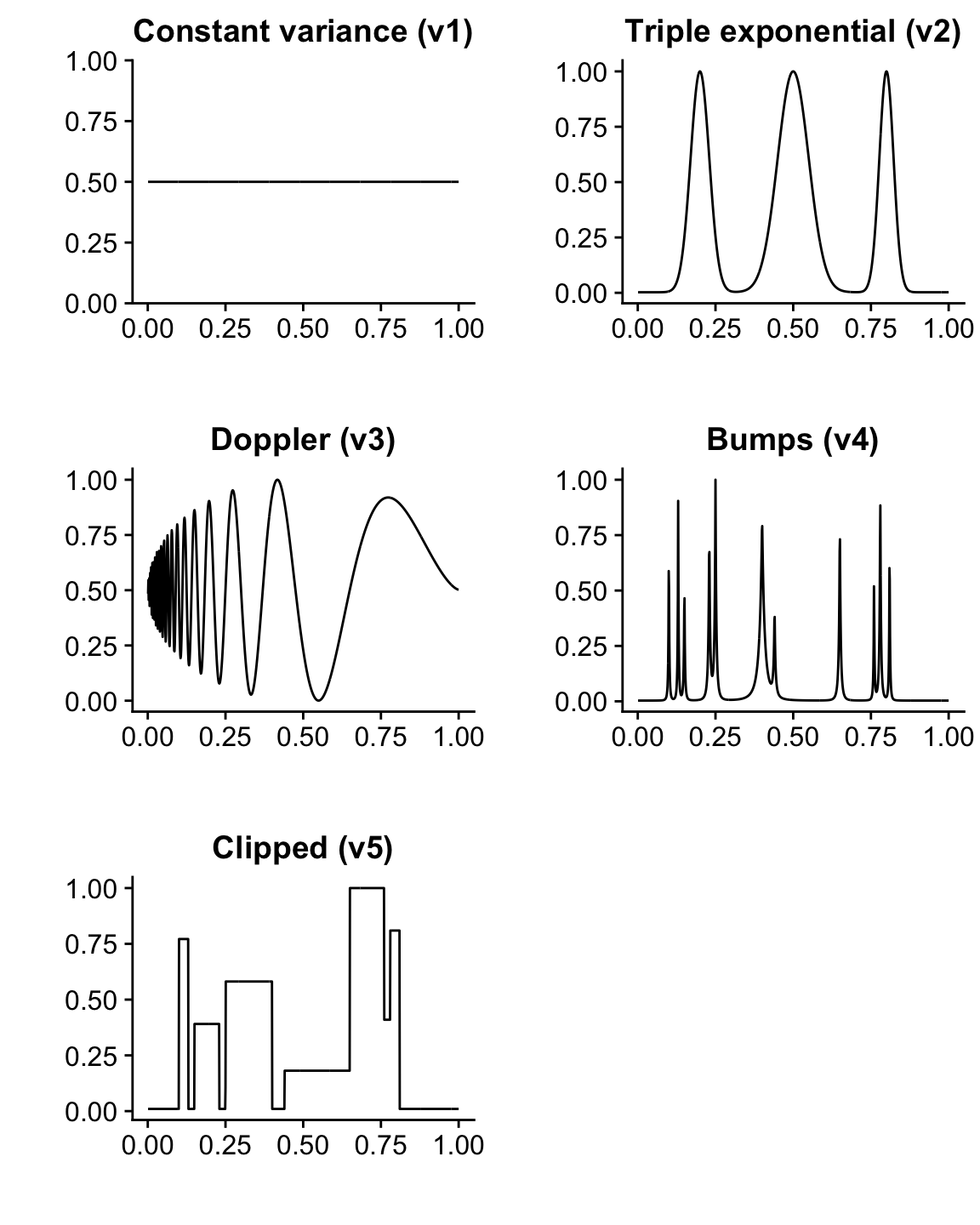 These plots show the variance functions used in generating the Gaussian data sets. In practice, these functions are rescaled in the simulations to achieve the desired signal-to-noise ratios (see the paper for a more detailed explanation).