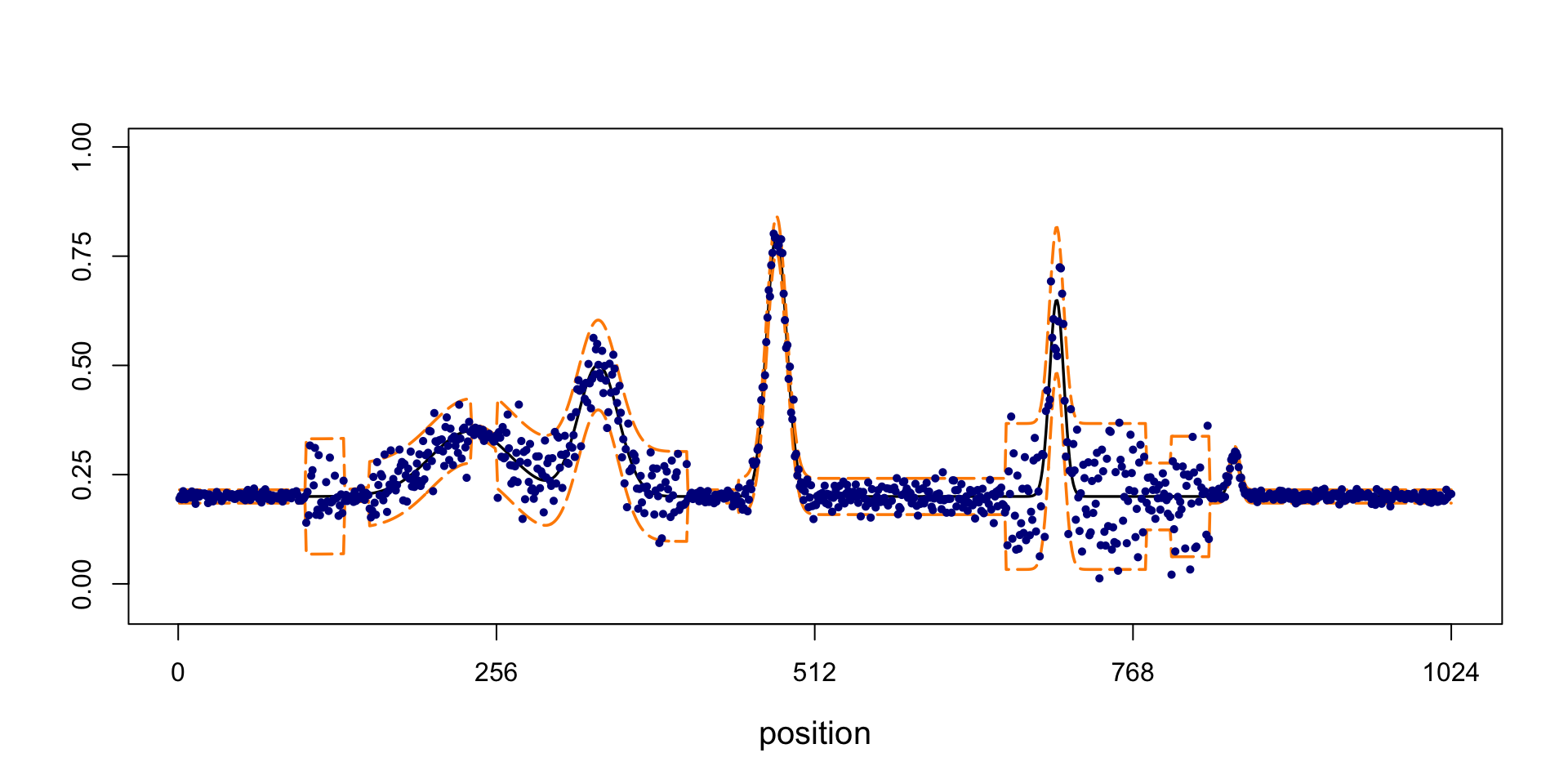 Simulate the noisy observations from the normal distribution with means that are given by the “spikes” function, and with spatially-structured variances given by the “clipped blocks” function.