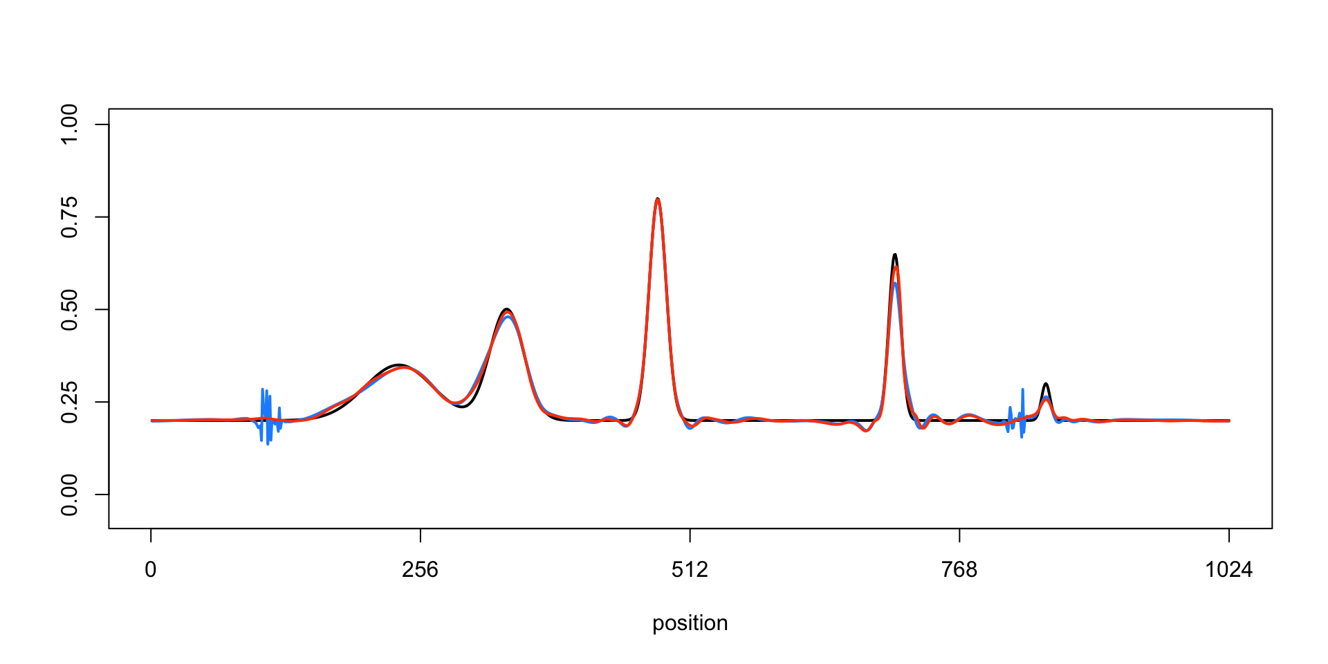 Finally, we plot the ground-truth signal (the mean function, drawn as a black line) and the signals recovered by TI thresholding (light blue line) and SMASH (the red line). The TI thresholding estimate shows notable artifacts.