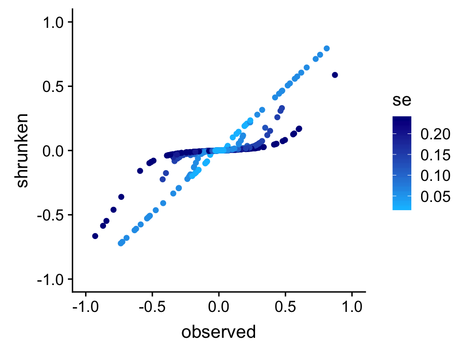 From this plot, we see that SMASH shrinks WCs differently depending on their precision; specifically, WCs that are less precise—i.e., higher standard error (s.e.)—are shrunk more strongly toward zero.