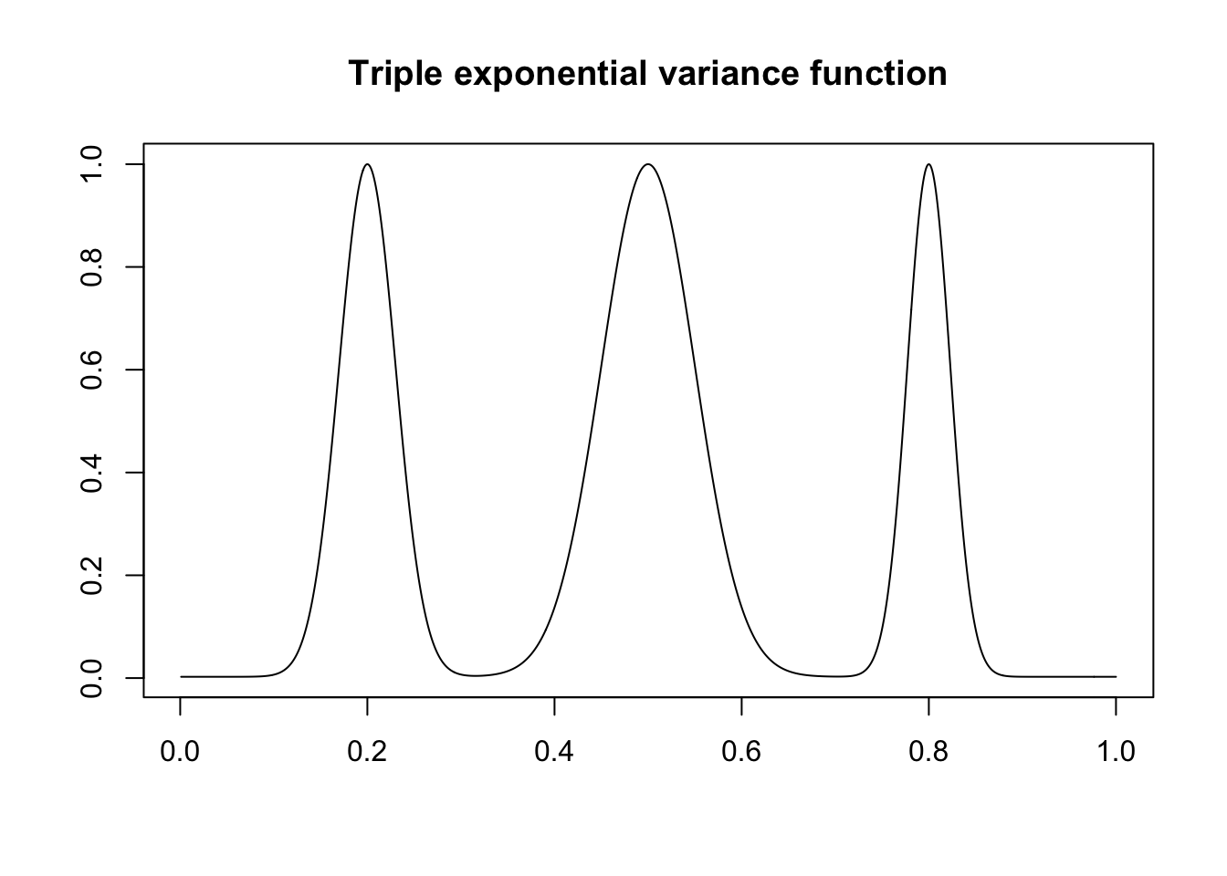 plot(t,var4,xlab = "",ylab = "",type = "l",main = "Bumps variance function")