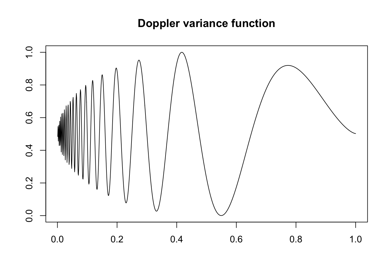 plot(t,var3,xlab = "",ylab = "",type = "l",main = "Doppler variance function")