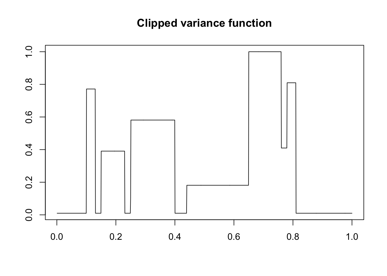 plot(t,var5,xlab = "",ylab = "",type = "l",main = "Clipped variance function")