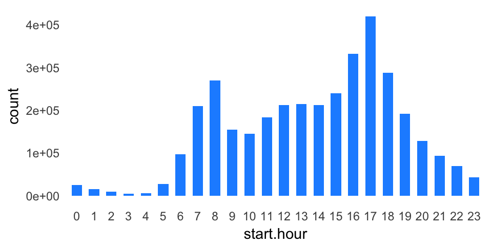 To make it easier to compile statistics by time of day, I convert the “start hour” column to a factor (i.e., categorical variable).