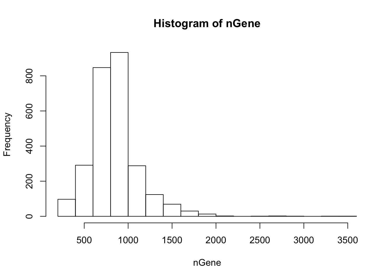 stringsAsFactors = FALSE)Get summary of the cells. The function “cellFilter” removes abnormal cells based on the read counts. The arguments minGene and maxGene restrict the number of genes detected in each cell. In 10X and Drop-seq data, having lower limit of 500 and upper limit of 2000 are generally appropriate. The cells with greater than 2000 detected genes are likeliy to be doublets, and those with less than 500 have too many dropouts. The default values are -Inf and Inf, so users are recommended to inspect the histogram of gene counts and determine the bounds. The function also requires the gene names to discover the mito-genes. Cells with high mitochondrial read proportion can indicate apoptosis. The default is 0.1.