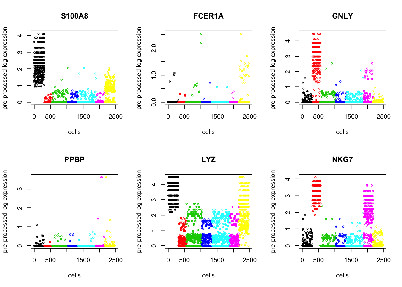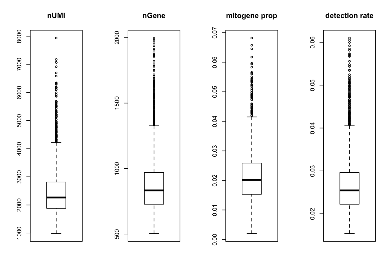 Get summary of the cells. The function “cellFilter” removes abnormal cells based on the gene counts. The arguments minGene and maxGene restrict the number of genes detected in each cell. In 10X and Drop-seq data, having lower limit of 500 and upper limit of 2000 are generally appropriate. The cells with greater than 2000 detected genes are likeliy to be doublets, and those with less than 500 have too many dropouts and does not have enough information. The default values are -Inf and Inf, so users are recommended to inspect the histogram of gene counts and determine the bounds. The function also requires the gene names to discover the mito-genes. Cells with high mitochondrial read proportion can indicate apoptosis. The default is 0.1.