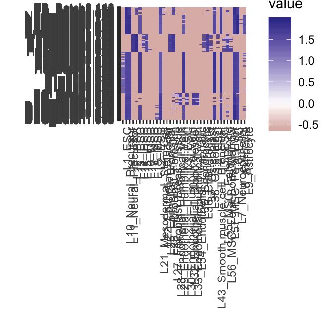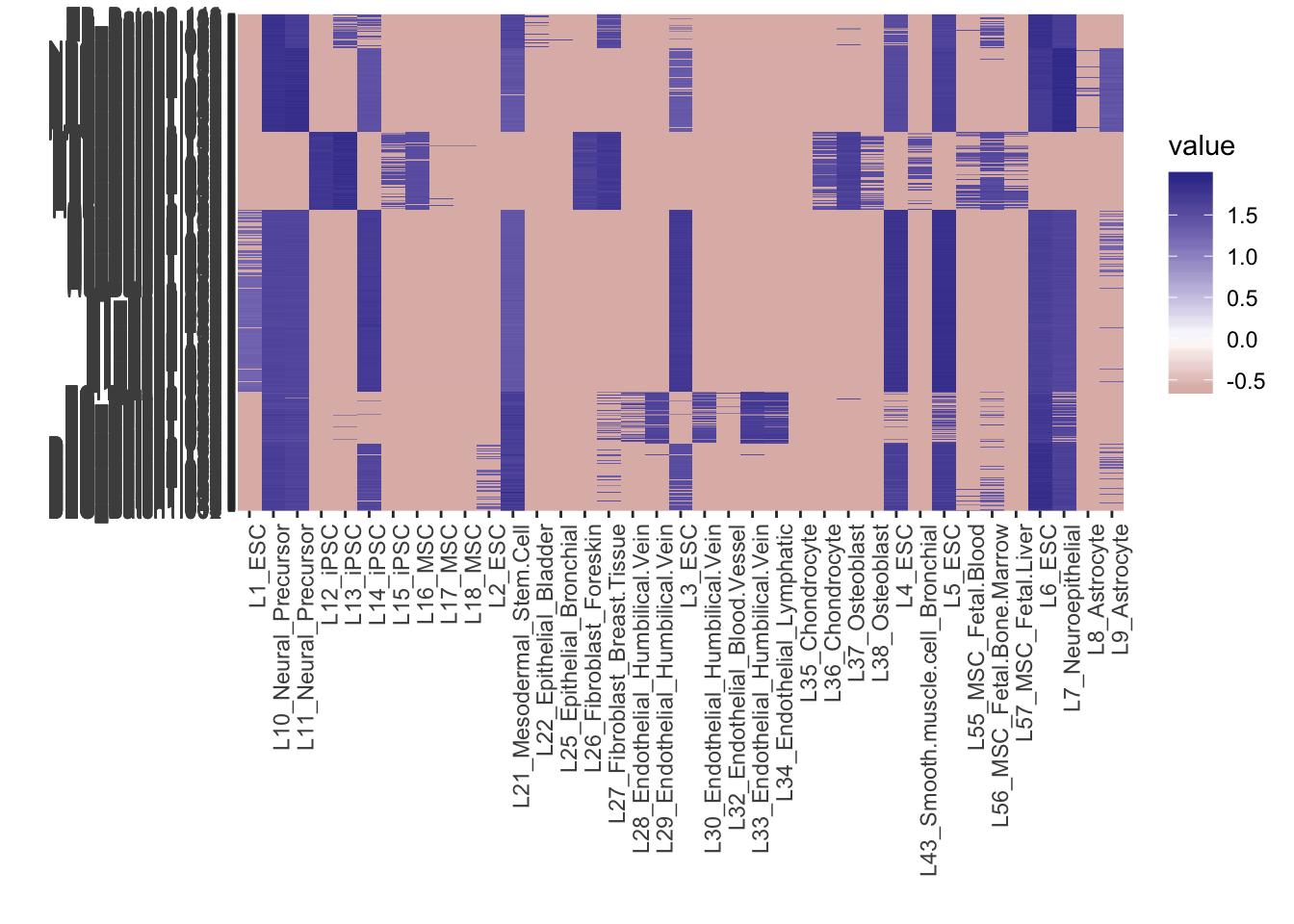 One can observe that in the cell atlas panel, ESC (embryonic stem cells) tend to show high correlation, which is as expected. Now, take a look at the heatmap of the similarity matrix of the projection matrix, and evaluate the clustering result.