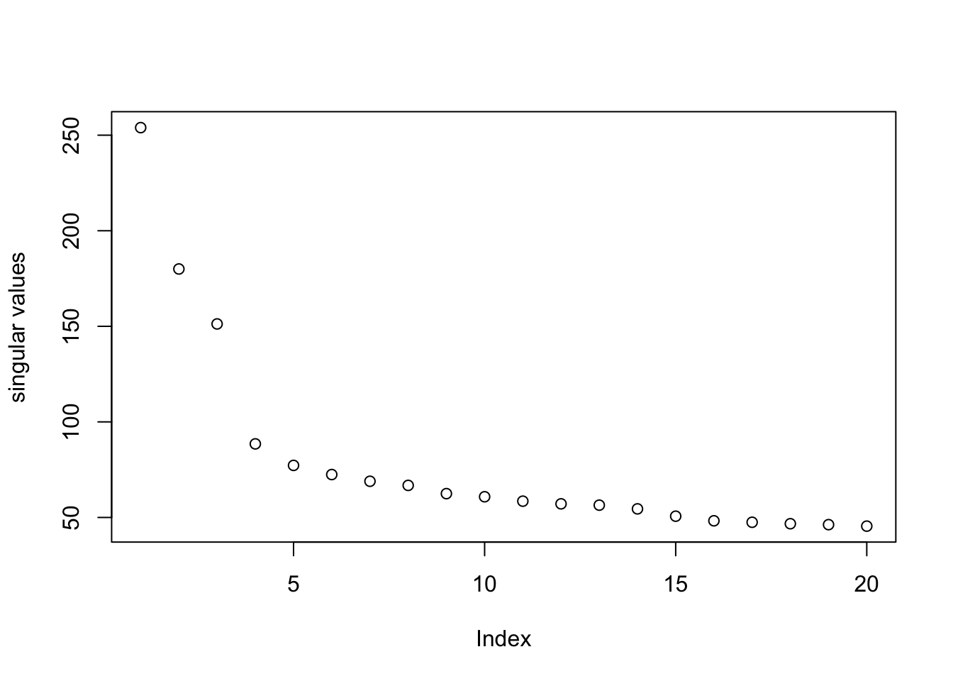 plot(pc.base$d, ylab = "singular values")