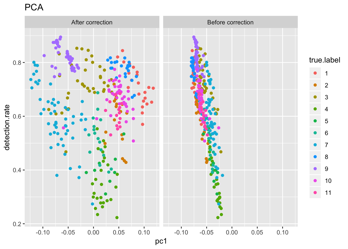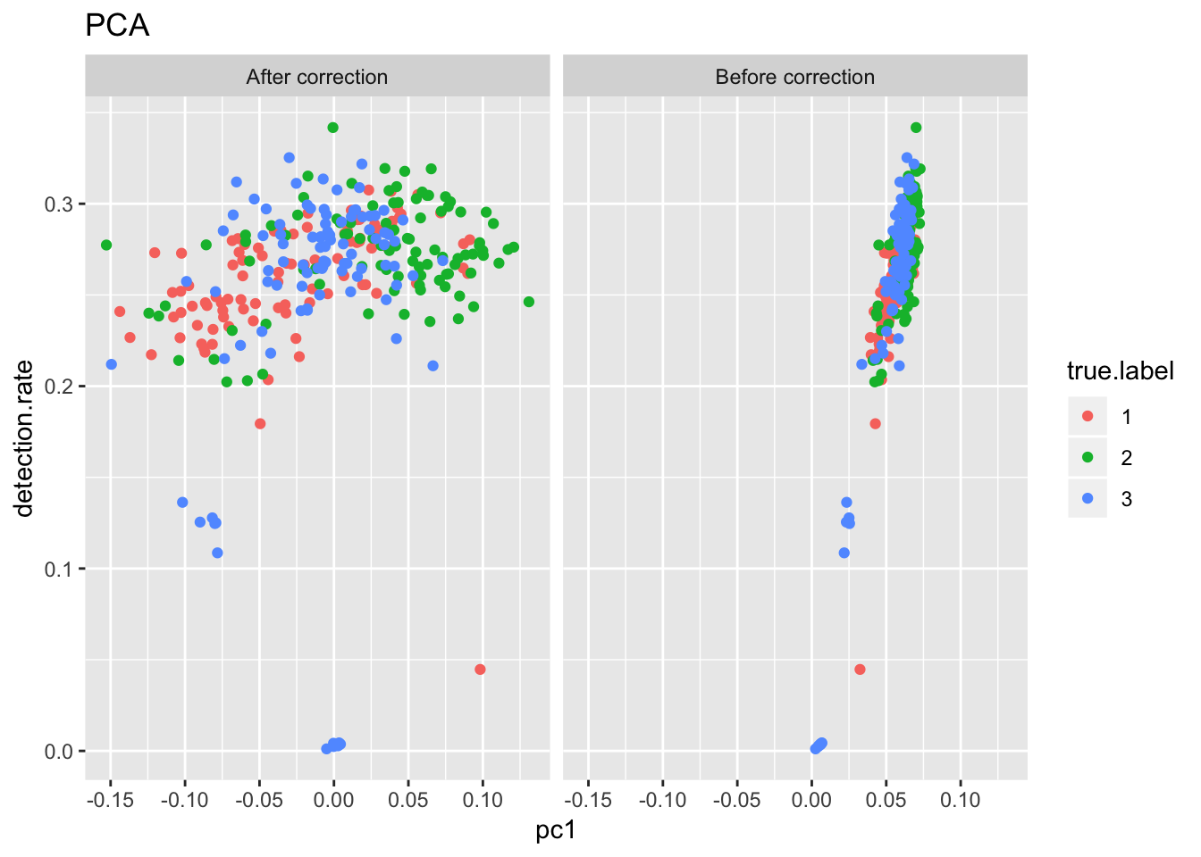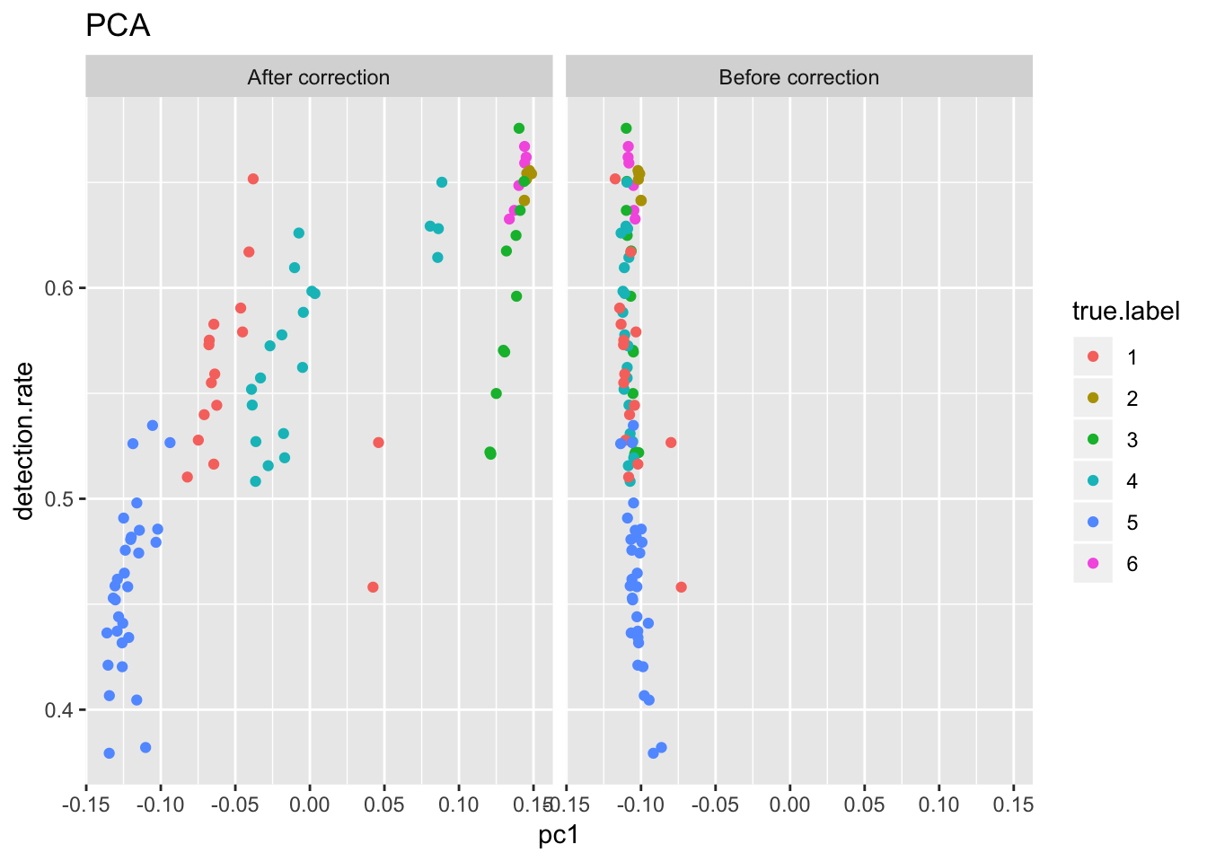 dat = data.frame(pc1=c(pca1$v[,1], pca2$v[,1]), detection.rate=rep(det, 2), label=rep(c("After correction", "Before correction"), each=nrow(pca1$v)), true.label=as.factor(rep(truth,2)))
