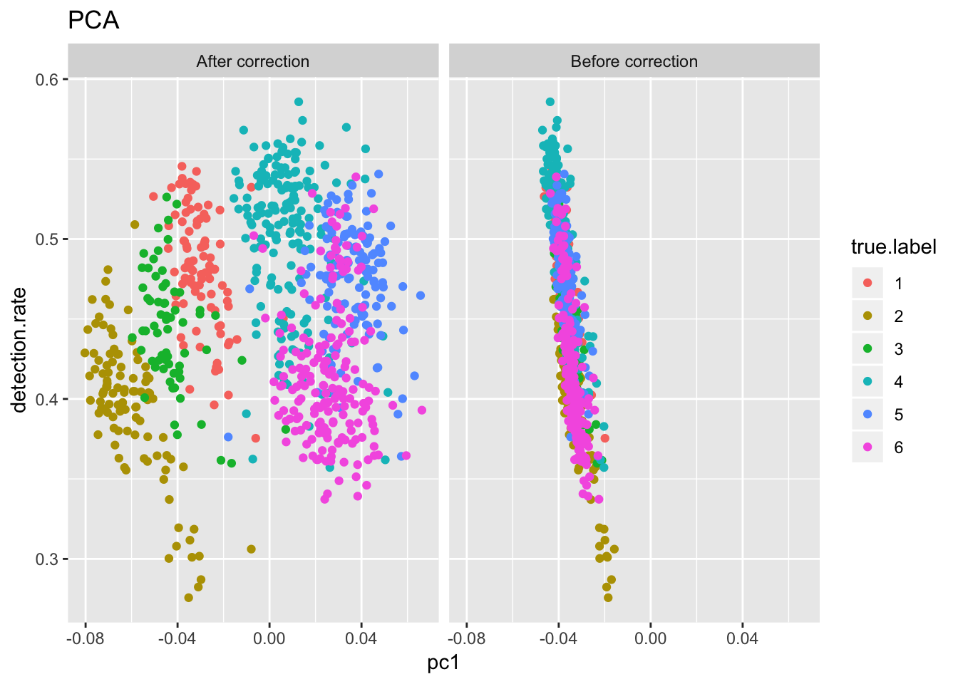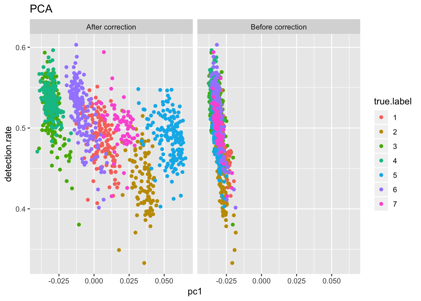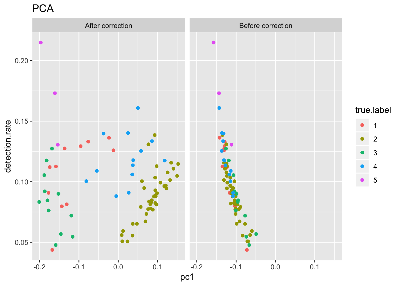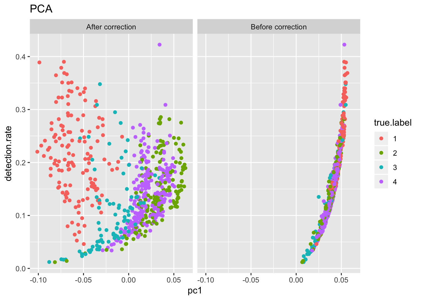 dat = data.frame(pc1=c(pca1$v[,1], pca2$v[,1]), detection.rate=rep(det, 2), label=rep(c("After correction", "Before correction"), each=nrow(pca1$v)), true.label=as.factor(rep(truth,2)))