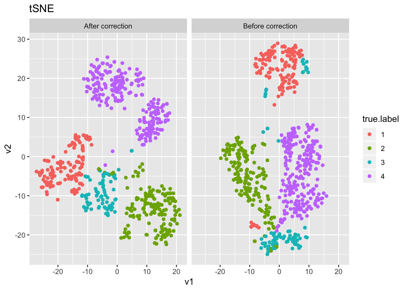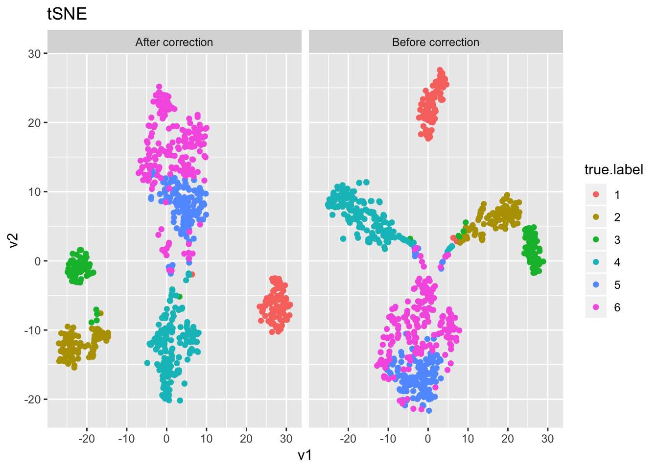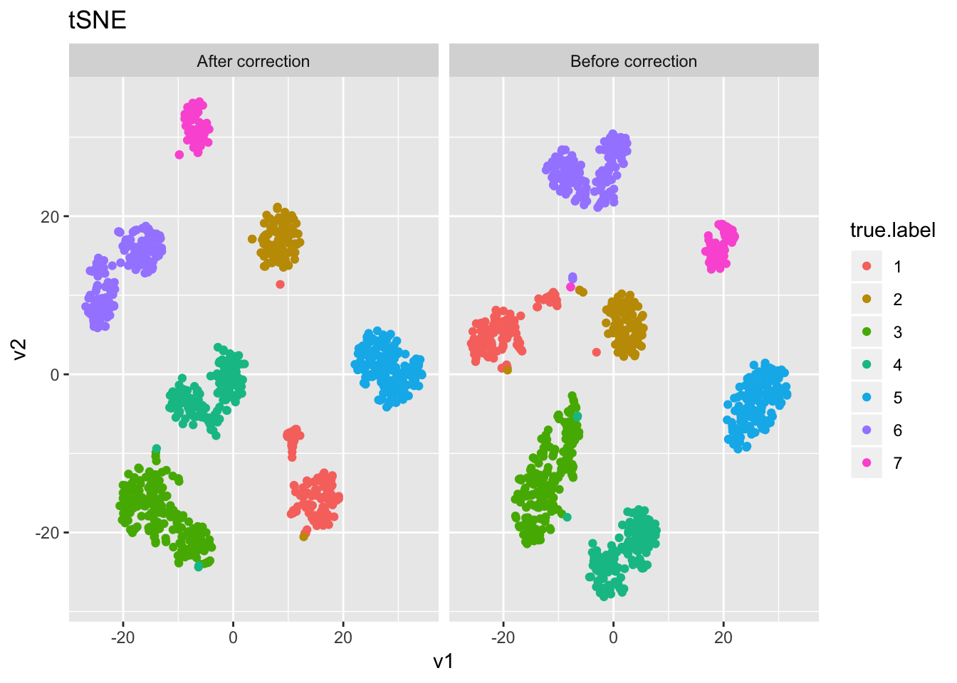 dat = data.frame(v1 = c(tsne1$Y[,1], tsne2$Y[,1]), v2 = c(tsne1$Y[,2], tsne2$Y[,2]), label=rep(c("After correction", "Before correction"), each=nrow(tsne1$Y)), true.label = as.factor(rep(truth, 2)))