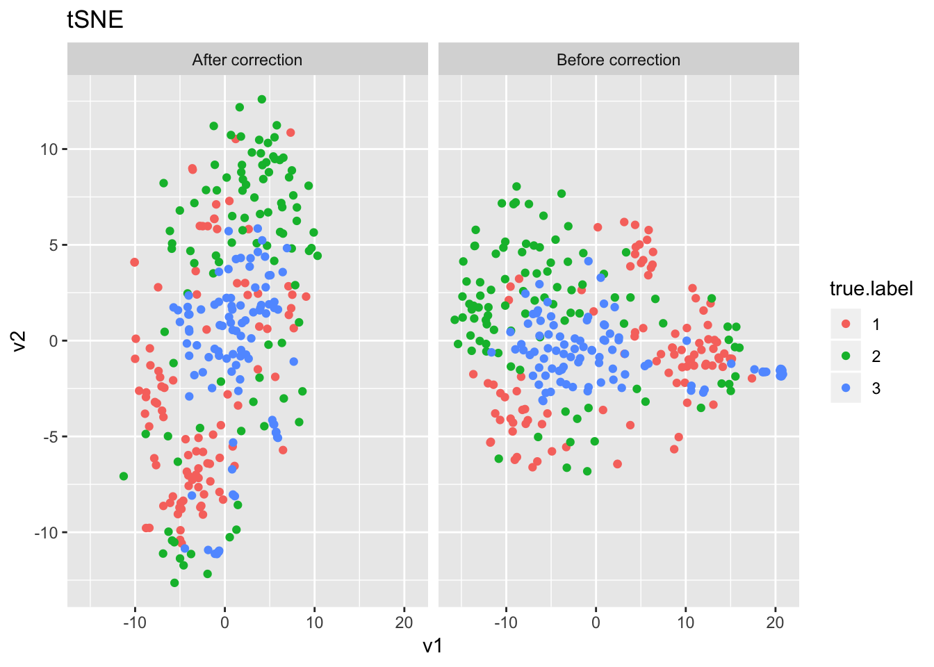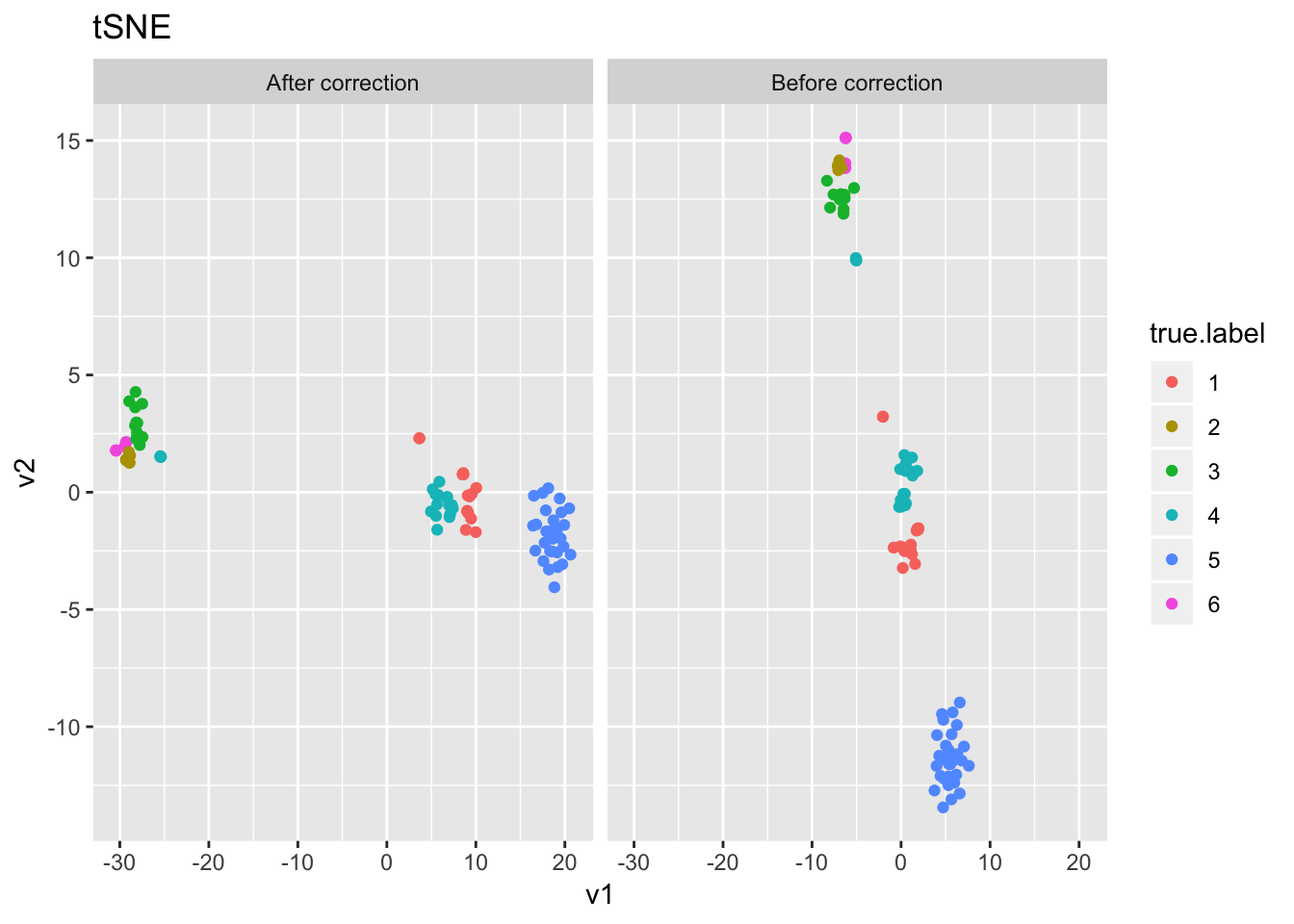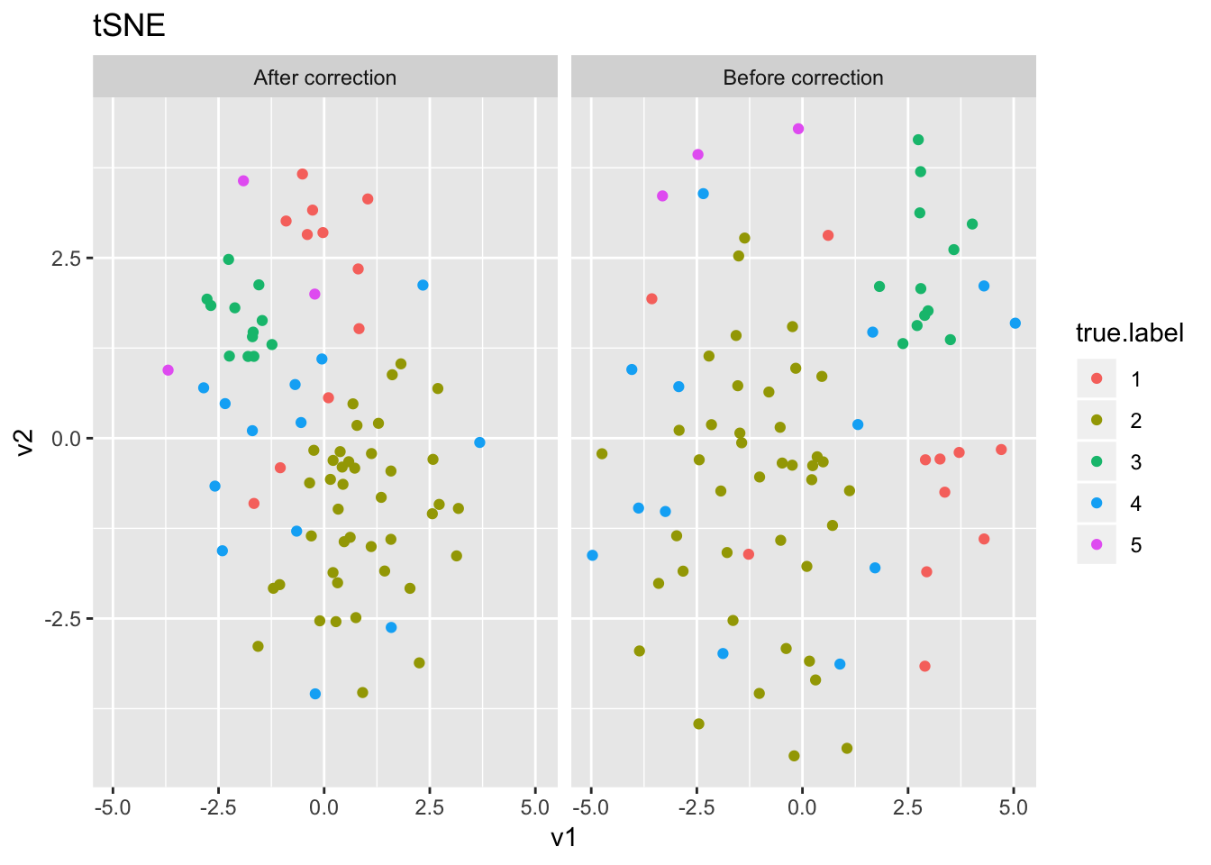 dat = data.frame(v1 = c(tsne1$Y[,1], tsne2$Y[,1]), v2 = c(tsne1$Y[,2], tsne2$Y[,2]), label=rep(c("After correction", "Before correction"), each=nrow(tsne1$Y)), true.label = as.factor(rep(truth, 2)))