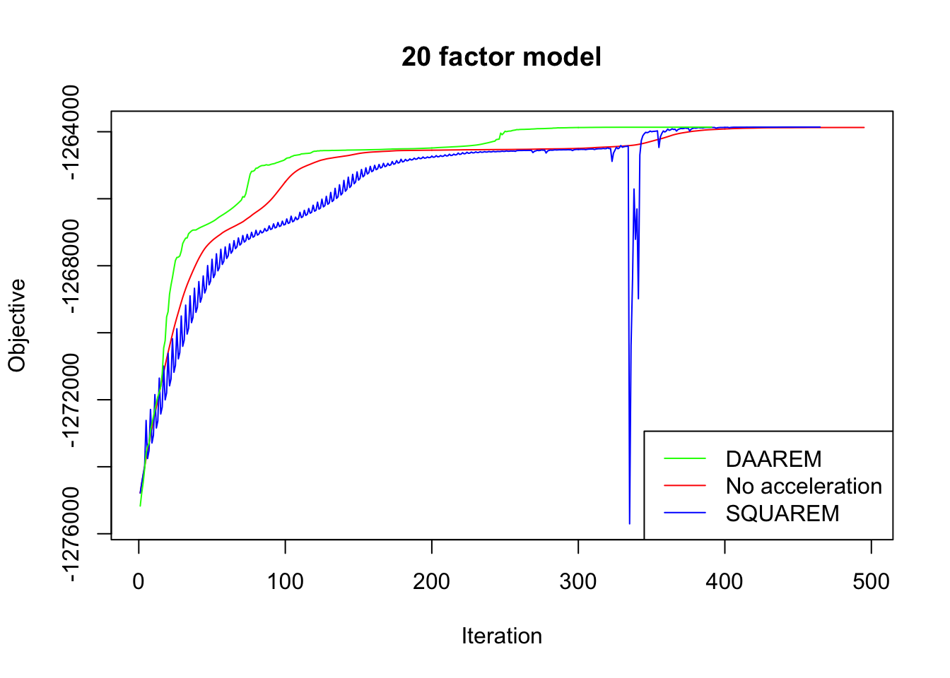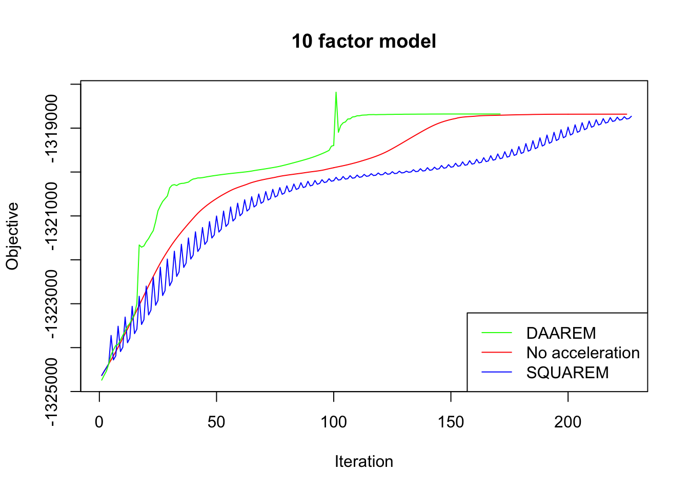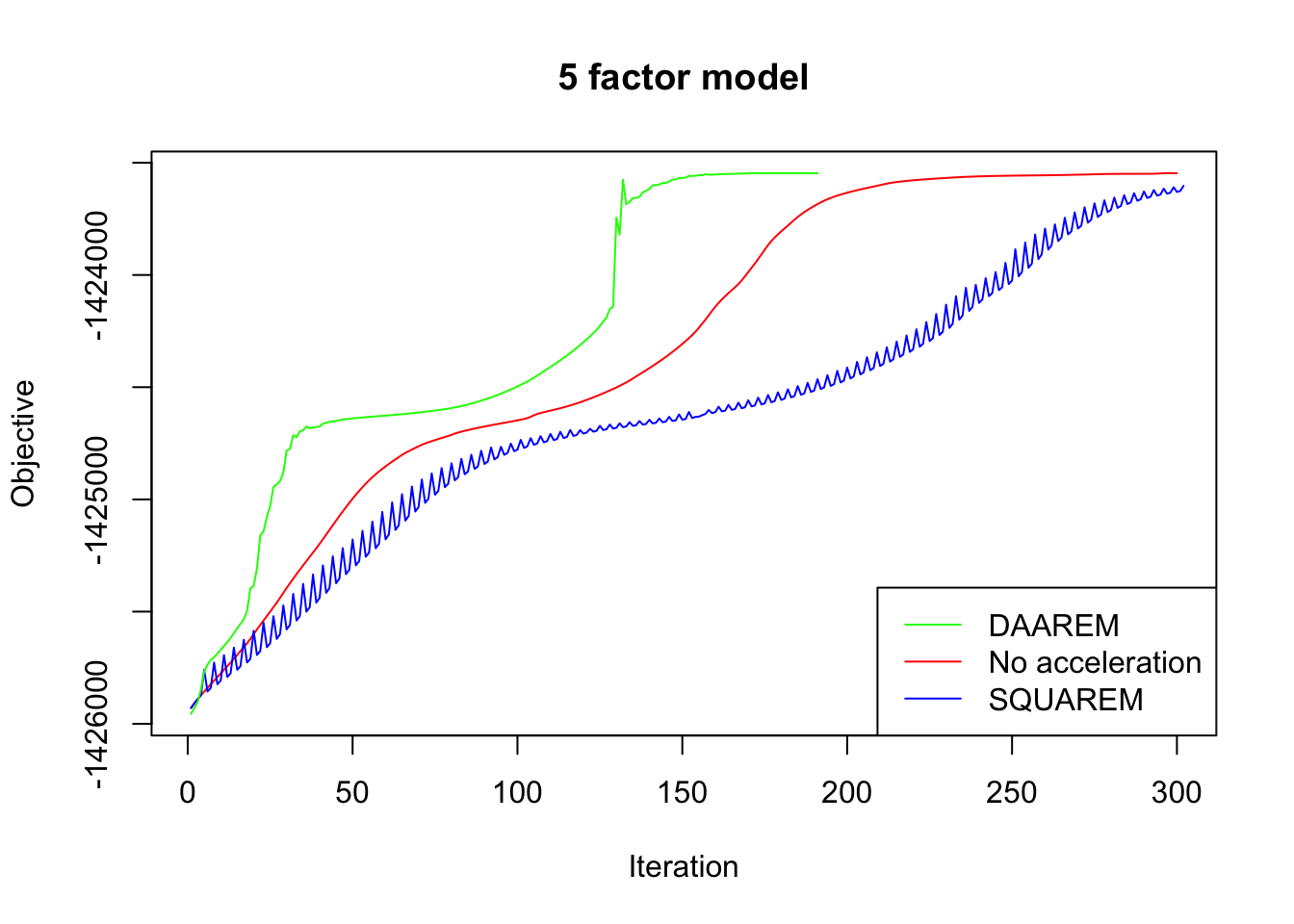 legend("bottomright", legend=c("DAAREM", "No acceleration", "SQUAREM"),