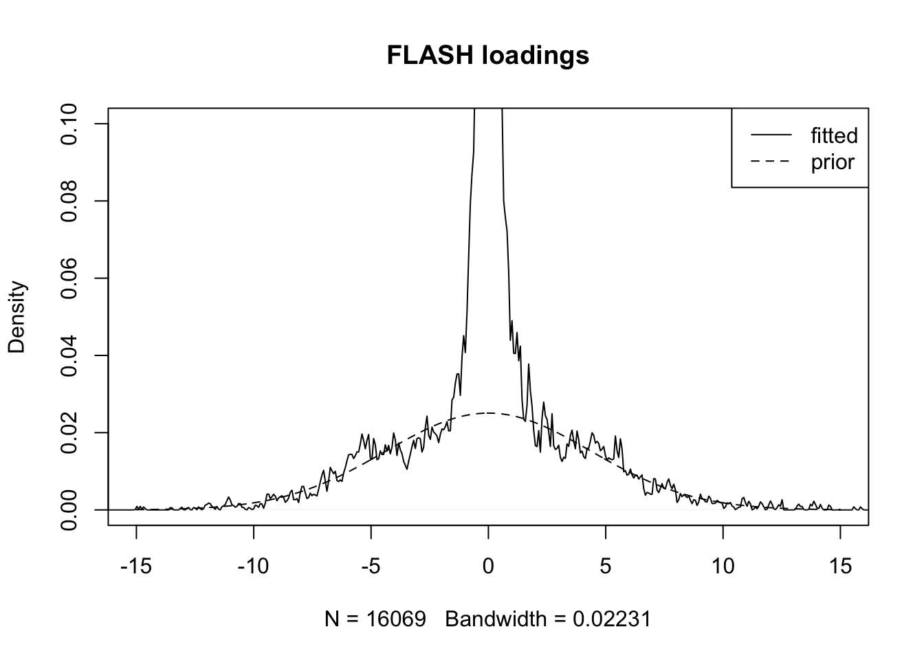To see what’s going on, I fit the estimated loadings against the estimated prior on the loadings. For the FLASH fit: