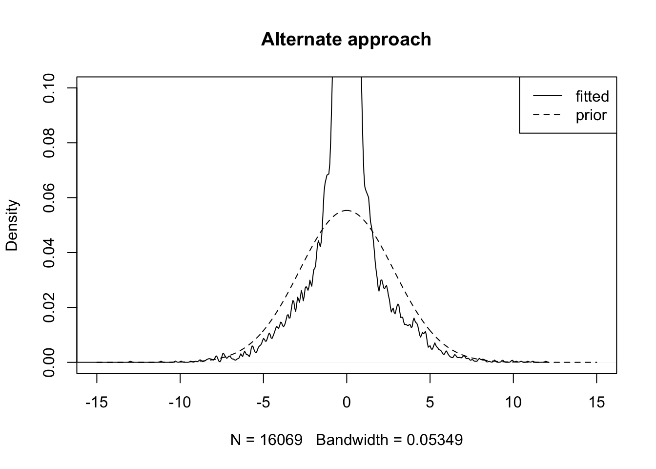 It seems almost as if FLASH were fitting the model \[ l_i \sim^{iid} g_l + e, \] where \(e\) is some error term, rather than the model \[ l_i \sim^{iid} g_l. \] This might explain why the prior gets pulled up more by the fitted values in the latter approach.