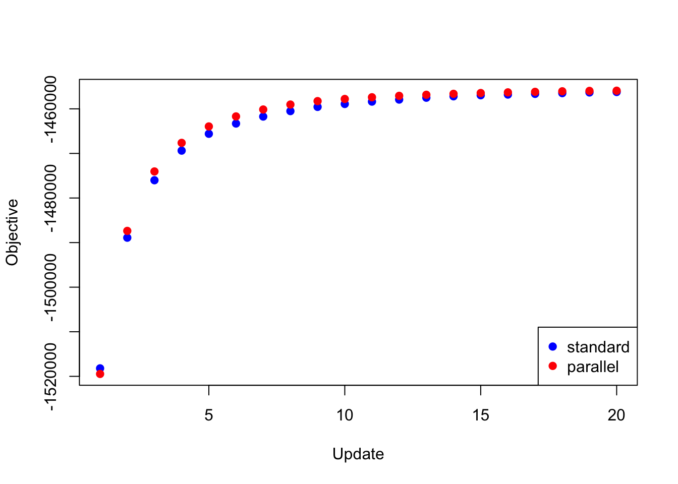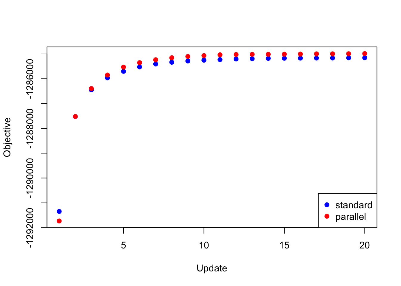 The difference in elapsed time is especially dramatic here. The parallel updates take less than a third of the time required by the serial updates:
