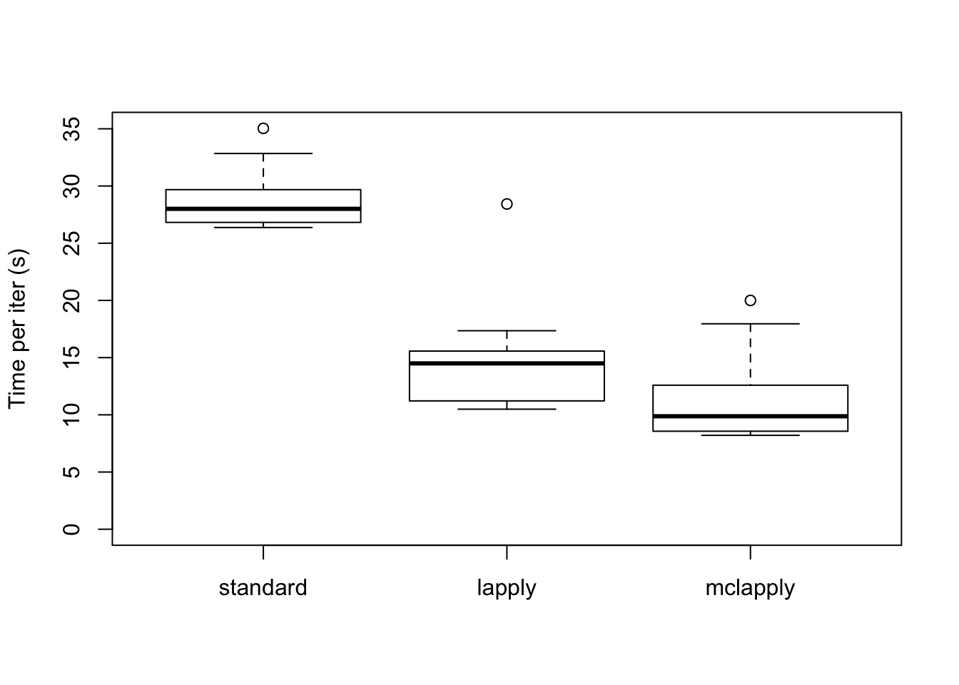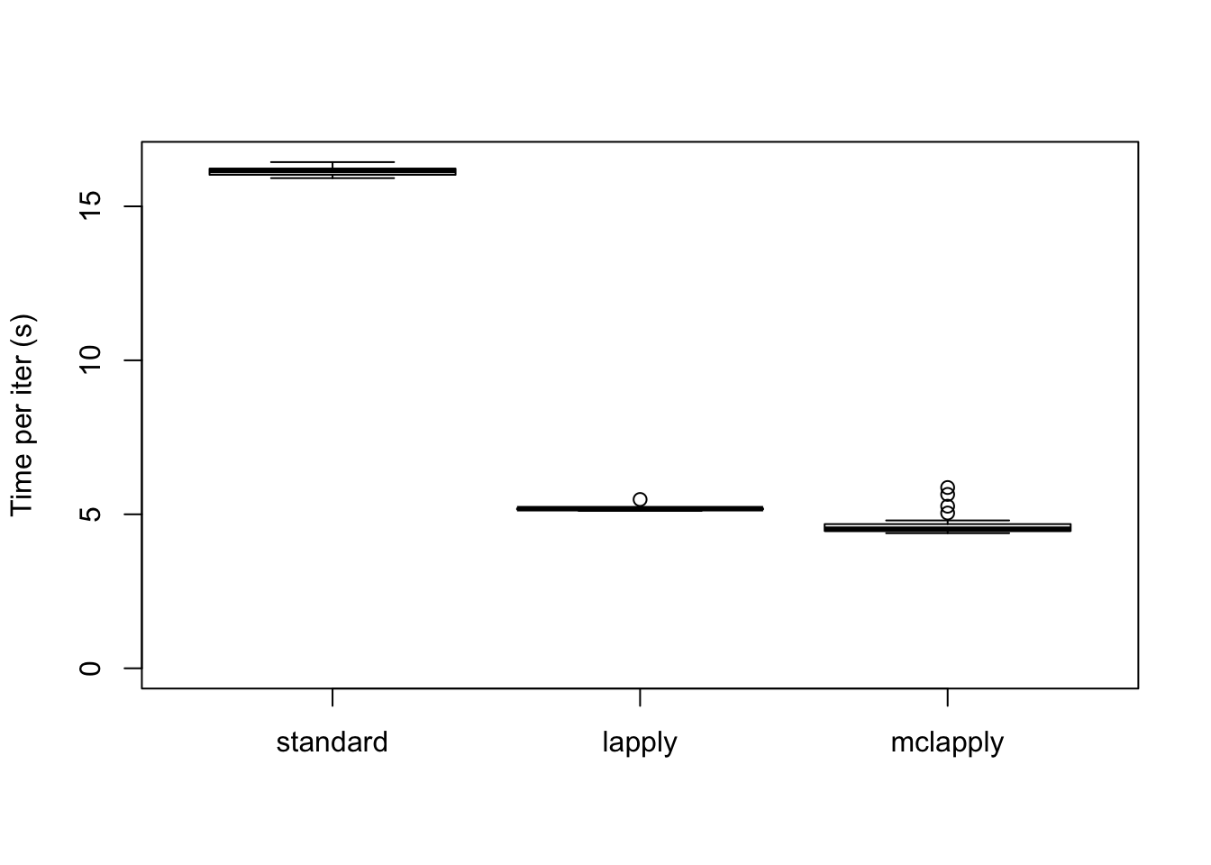 boxplot(data, ylim=c(0, max(data)), ylab="Time per iter (s)")