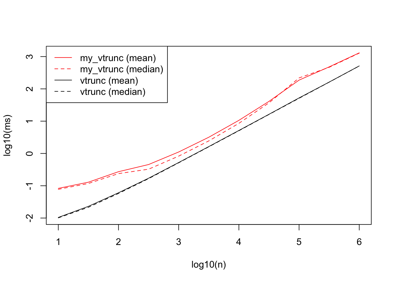 res <- do_benchmark(ns, vtruncnorm, my_vtruncnorm)