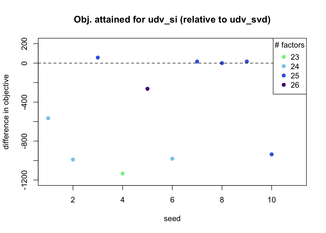 So, six seeds yield an objective that is much worse than the objective attained using udv_svd, and four seeds yield an objective that is as good or slightly better. The latter all include 25 factor/loading pairs, which is also the number of factor/loading pairs given by udv_svd.