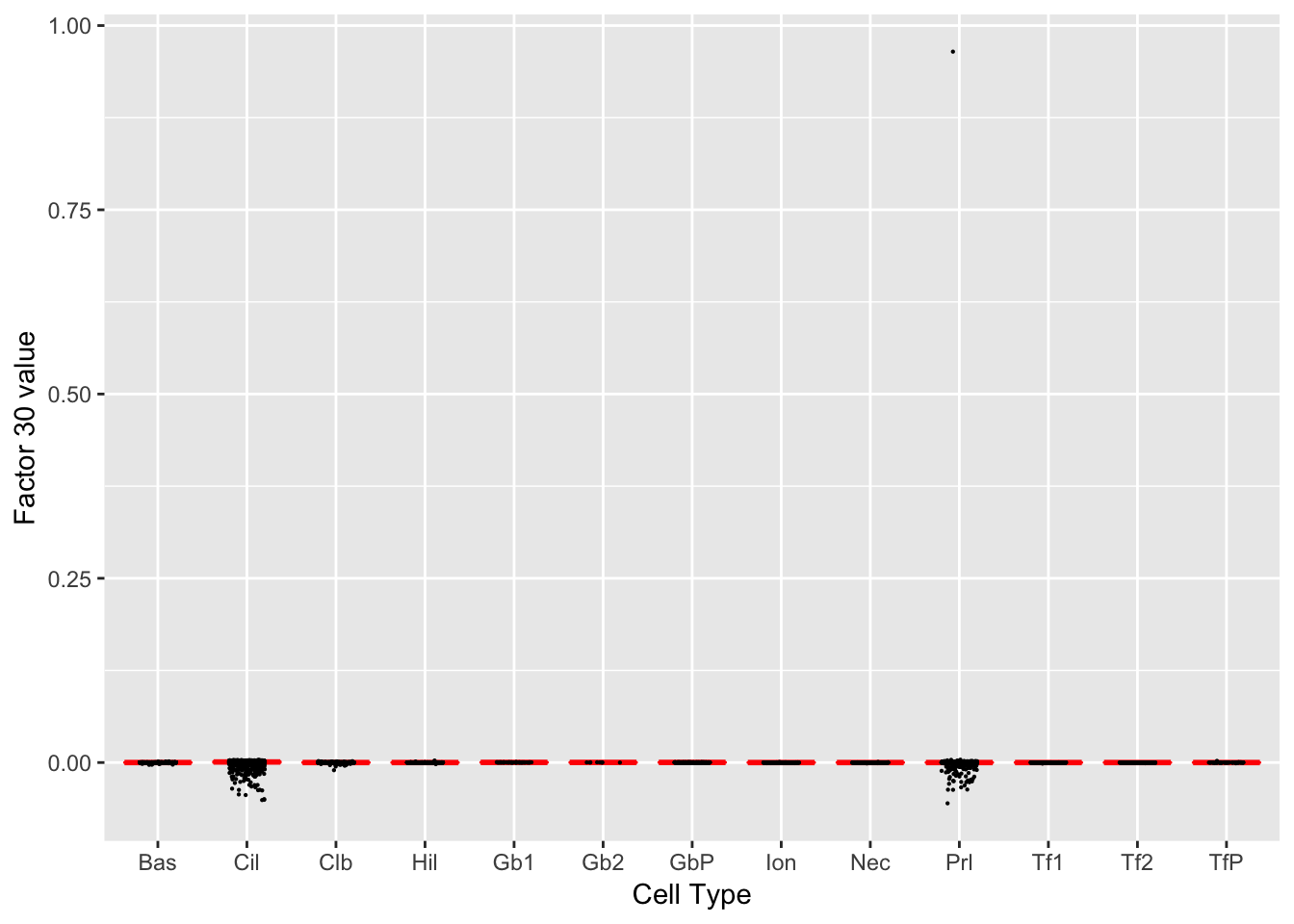 I fit 30 factors with normal-mixture priors to the pulse-seq dataset discussed in Montoro et al. I removed all genes with zero total counts and did a log1p transform of the counts. I used the following calls.