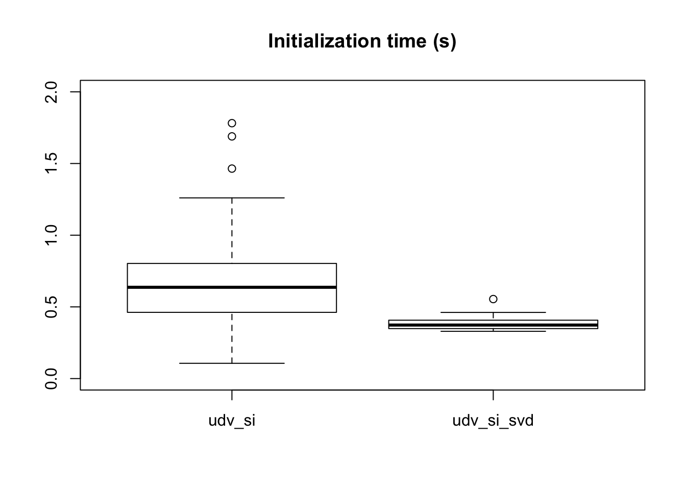 More surprisingly, I was unable to verify earlier results that concluded that udv_si (that is, softImpute with option type = "als") is faster than udv_si_svd (softImpute with option type = "svd"). On the contrary, udv_si_svd appears to be slightly faster, and again has the advantage that it is not random. Further, the algorithm is somewhat simpler to understand. Thus I recommend setting the default init_fn to udv_si_svd when data is missing.