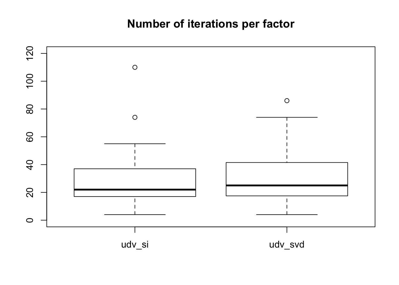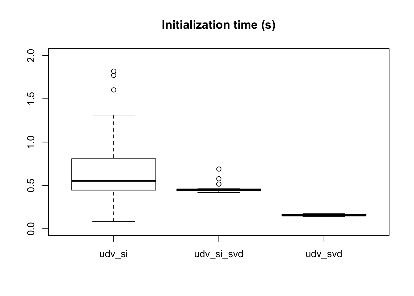 As expected, udv_svd is fastest, but there is only about 10 seconds difference between udv_svd and udv_si (the slowest method). This difference is not hugely important given that the overall fit takes several minutes.