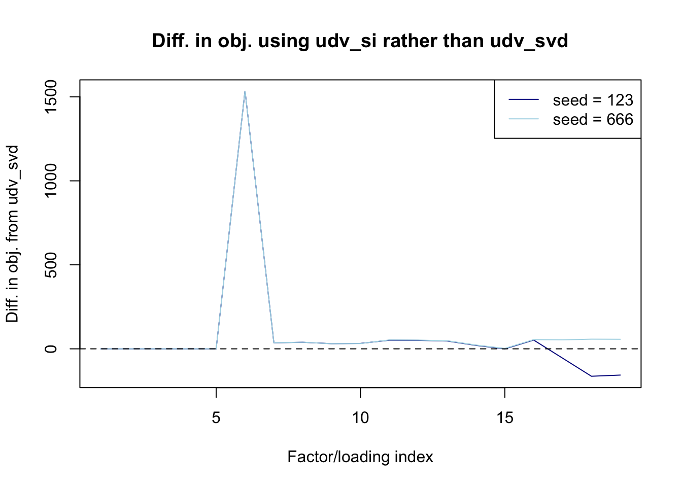 main="Diff. in obj. using udv_si rather than udv_si_svd")
