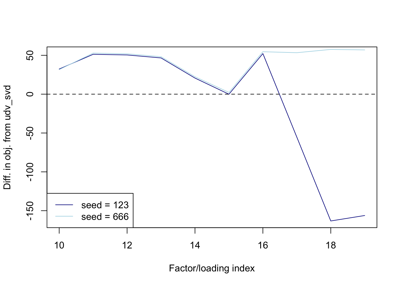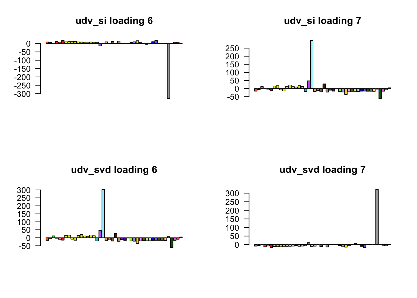 Note that udv_svd is doing much worse at factor/loading 6, but catches up at factor/loading 7. In fact, both methods are actually adding the “same” factor/loading pairs here, but they do so in a different order: