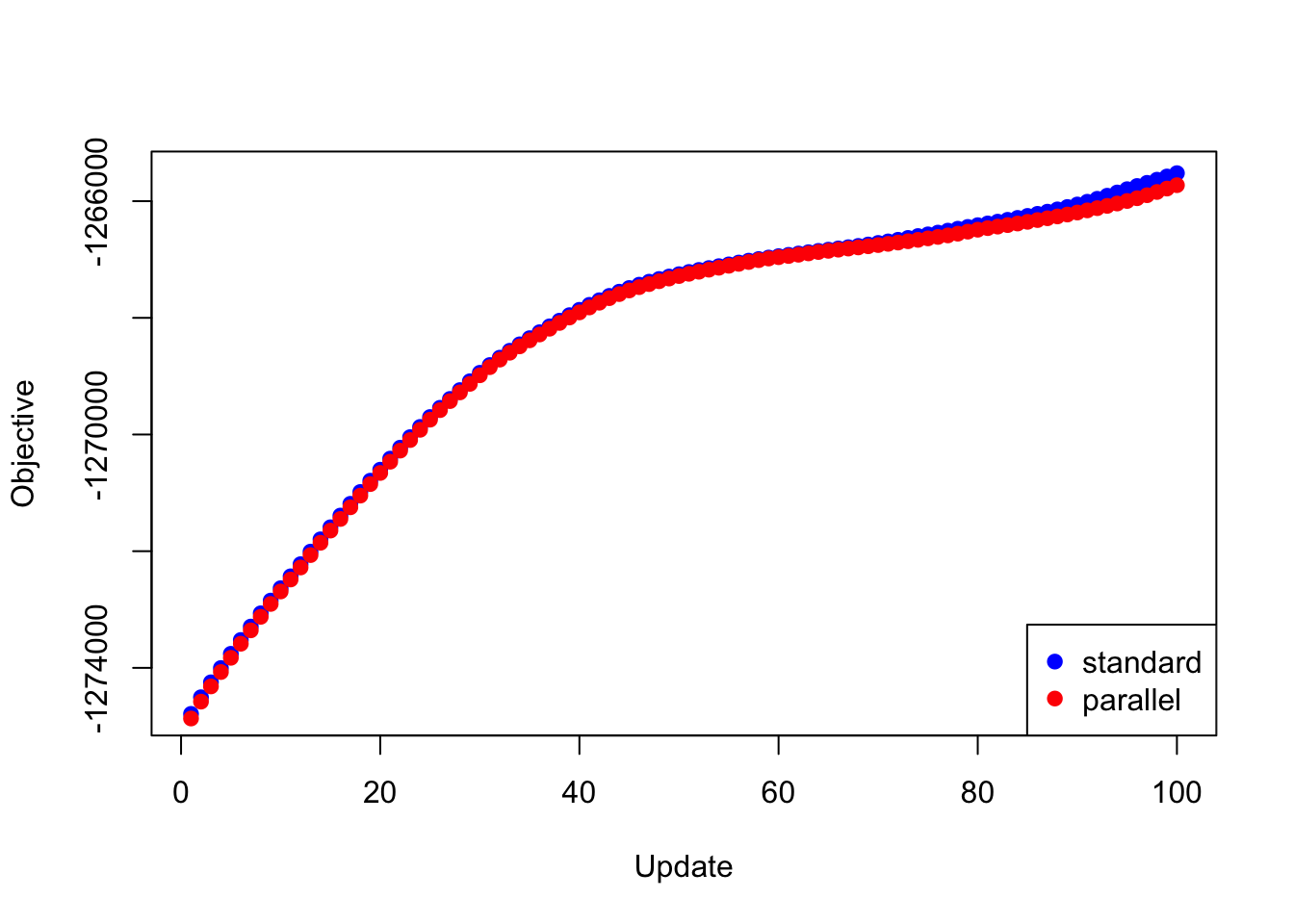 The objectives attained using each backfitting method are very similar (the objectives for the lapply and mclapply methods are of course identical, so I only give “standard” and “parallel” results below):