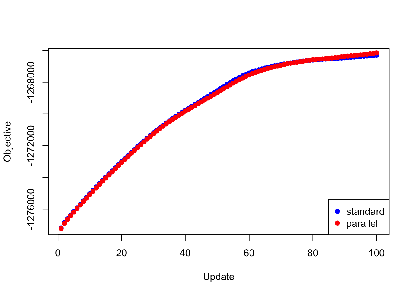 Next I give results for the 20 factors obtained using flash_add_factors_from_data. In this case, the parallel updates attain a better objective than the standard updates after 80 iterations or so: