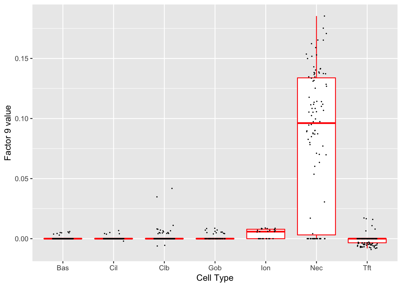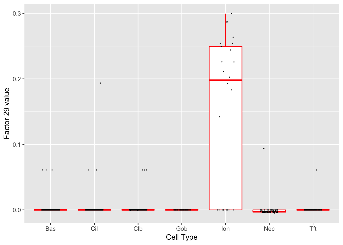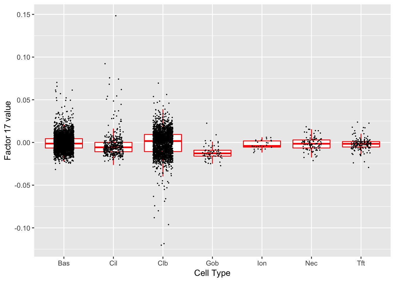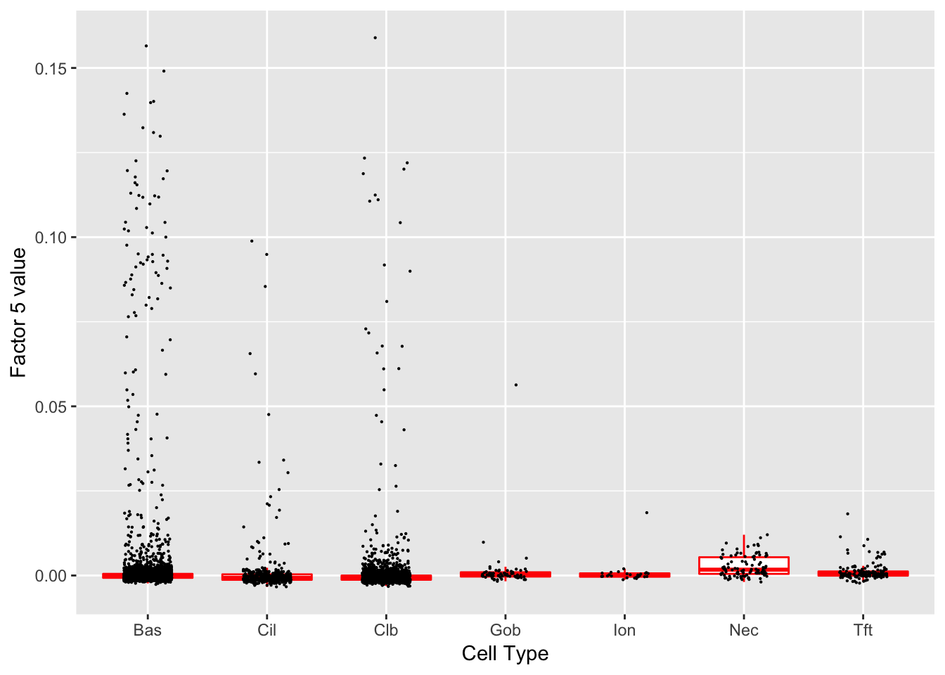 I fit 30 factors to the drop-seq dataset discussed in Montoro et al. I removed all genes with zero total counts and did a log1p transform of the counts. I used nonnegative priors for gene loadings and normal-mixture priors for cell loadings.