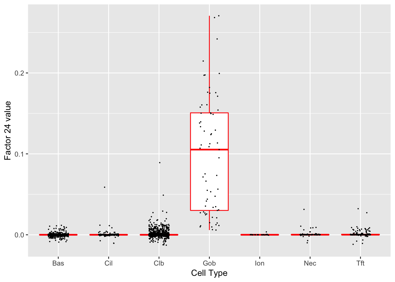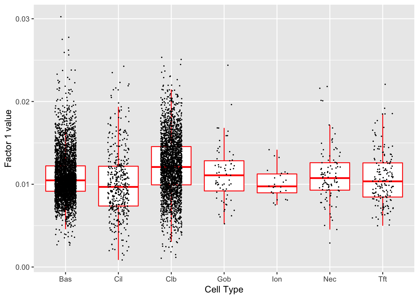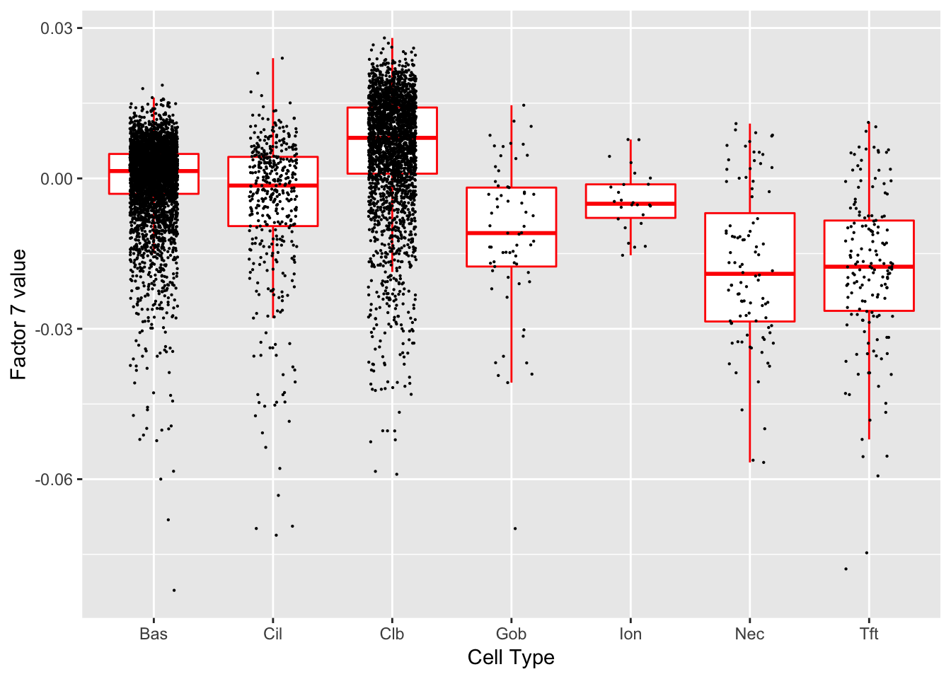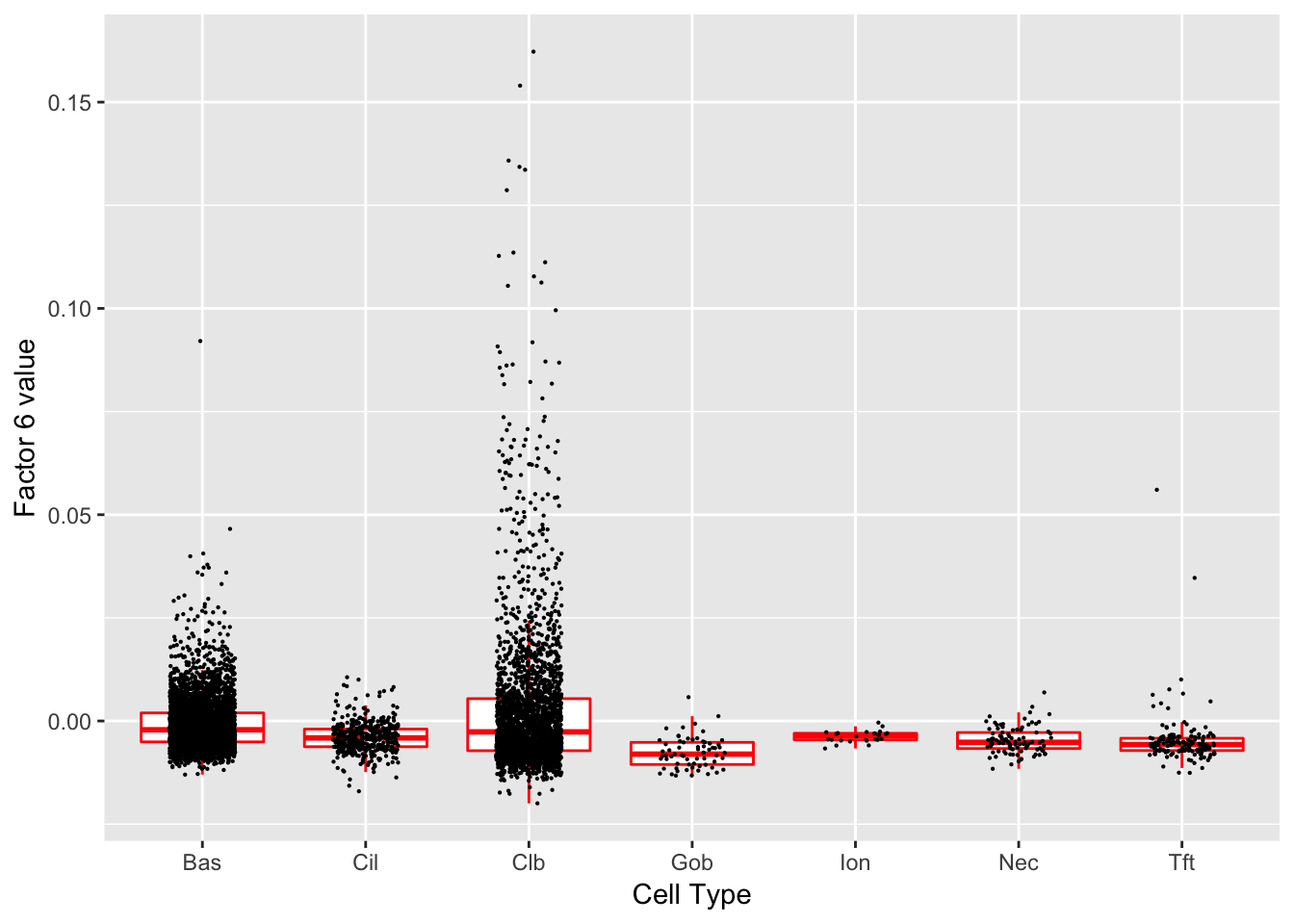 I fit 30 factors to the drop-seq dataset discussed in Montoro et al. I removed all genes with zero total counts and did a log1p transform of the counts. I used nonnegative priors for gene loadings and normal-mixture priors for cell loadings.