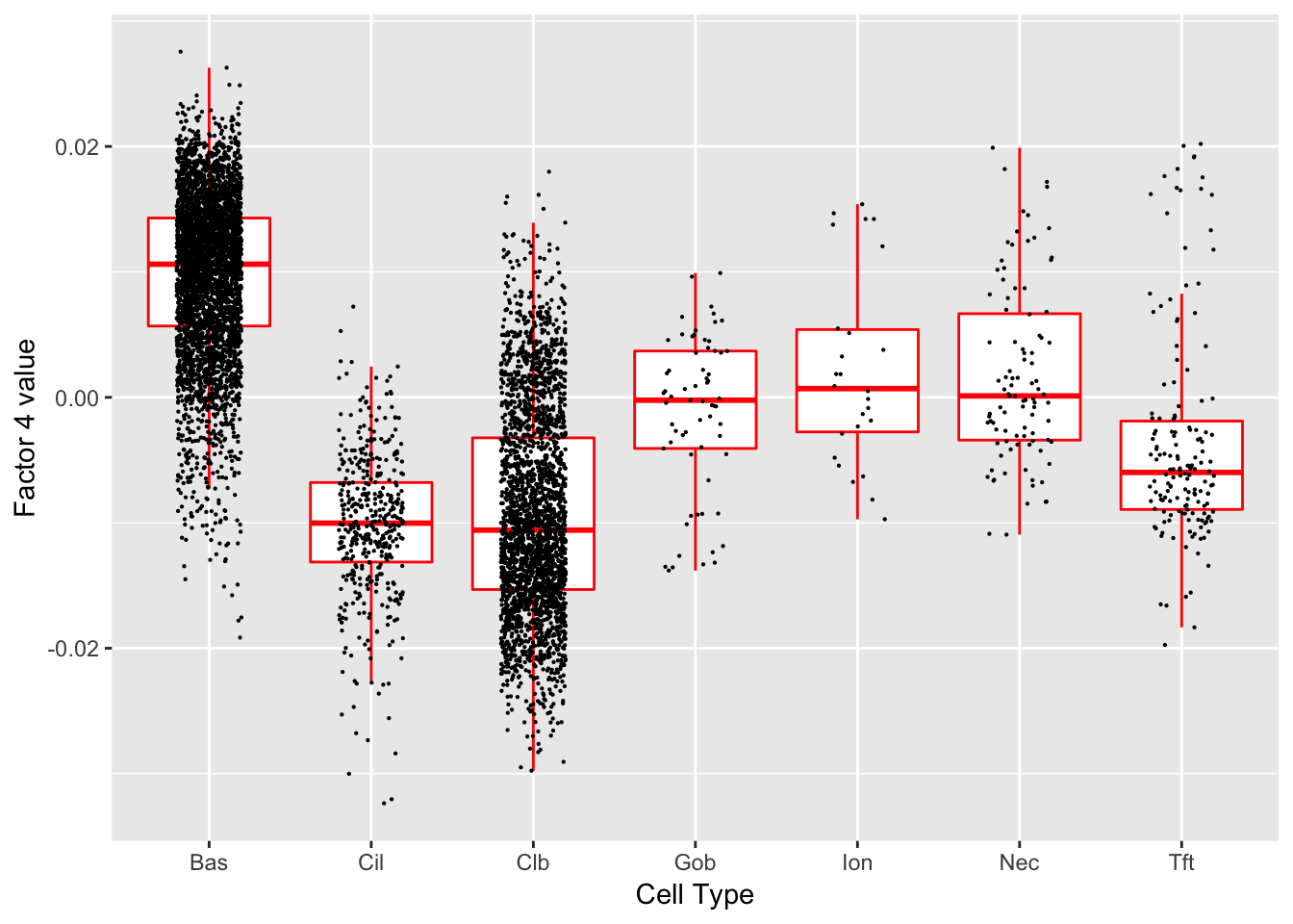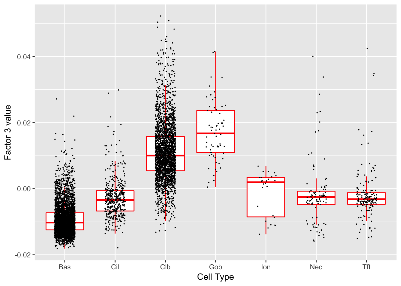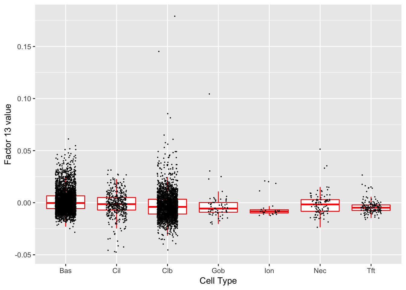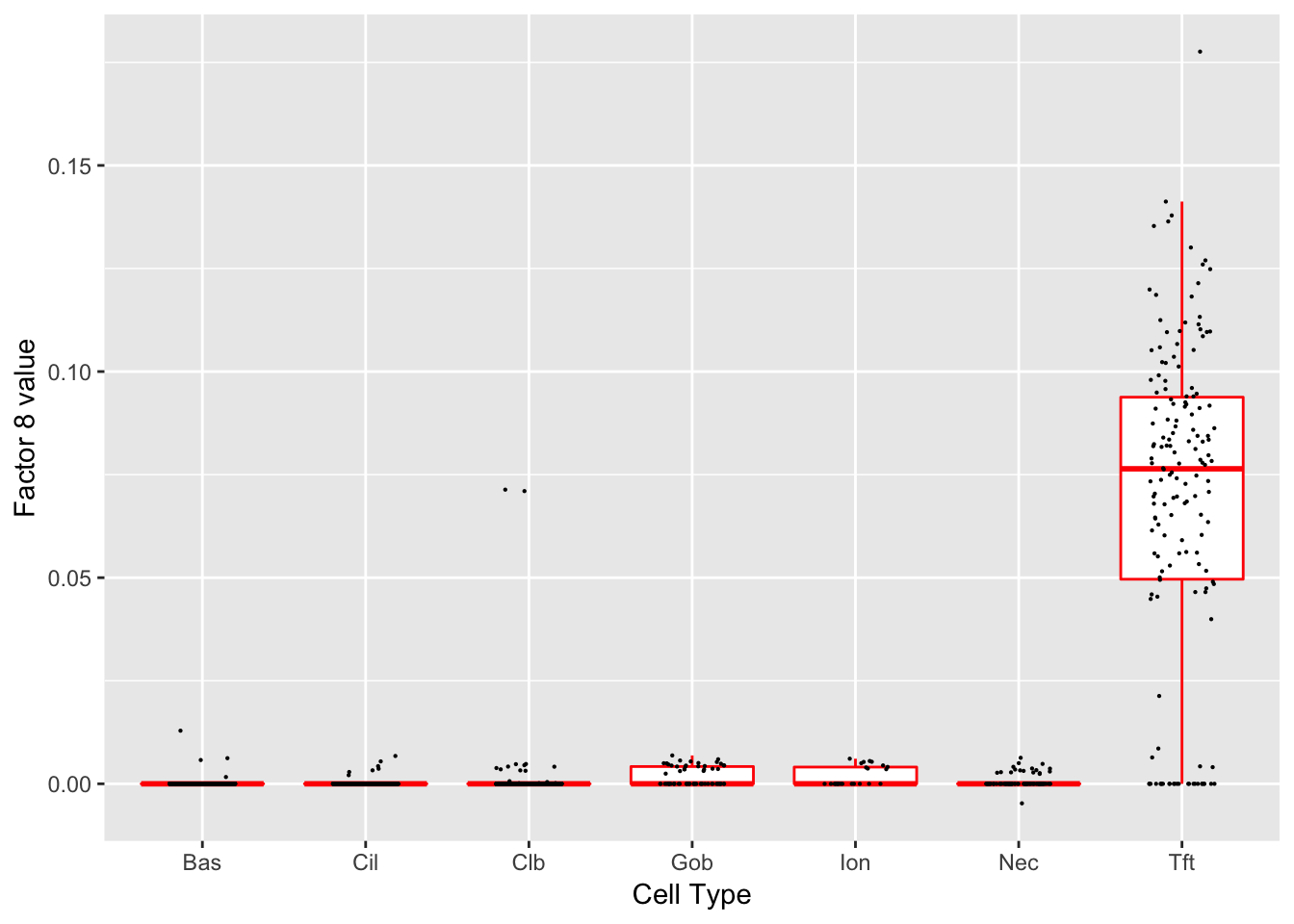 I fit 30 factors to the drop-seq dataset discussed in Montoro et al. I removed all genes with zero total counts and did a log1p transform of the counts. I used nonnegative priors for gene loadings and normal-mixture priors for cell loadings.