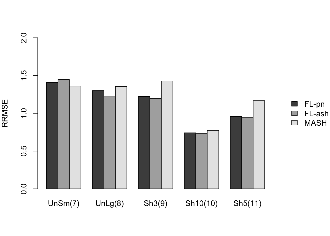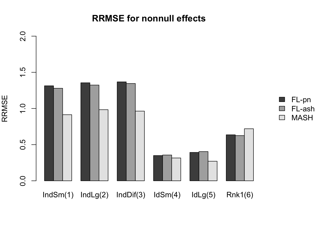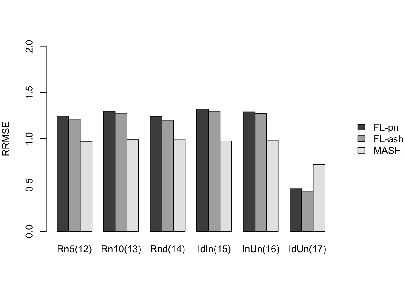 Results for other covariance types are more varied: MASH appears to do better on identical effects (types 4-5, whose covariance structures are included as “canonical”), but slightly worse on rank-one effects (type 6, which is not accounted for by canonical covariance matrices). FLASH seems to outperform MASH on shared effects (types 9-11), but (somewhat surprisingly) MASH does better on random covariance matrices and on combinations involving independent effects (types 12-16), with an RRMSE near 1 (whereas FLASH is again outperformed by the naive estimate \(\hat{X} = Y\)). Finally, FLASH does much better on a combination of identical and unique effects (type 17).