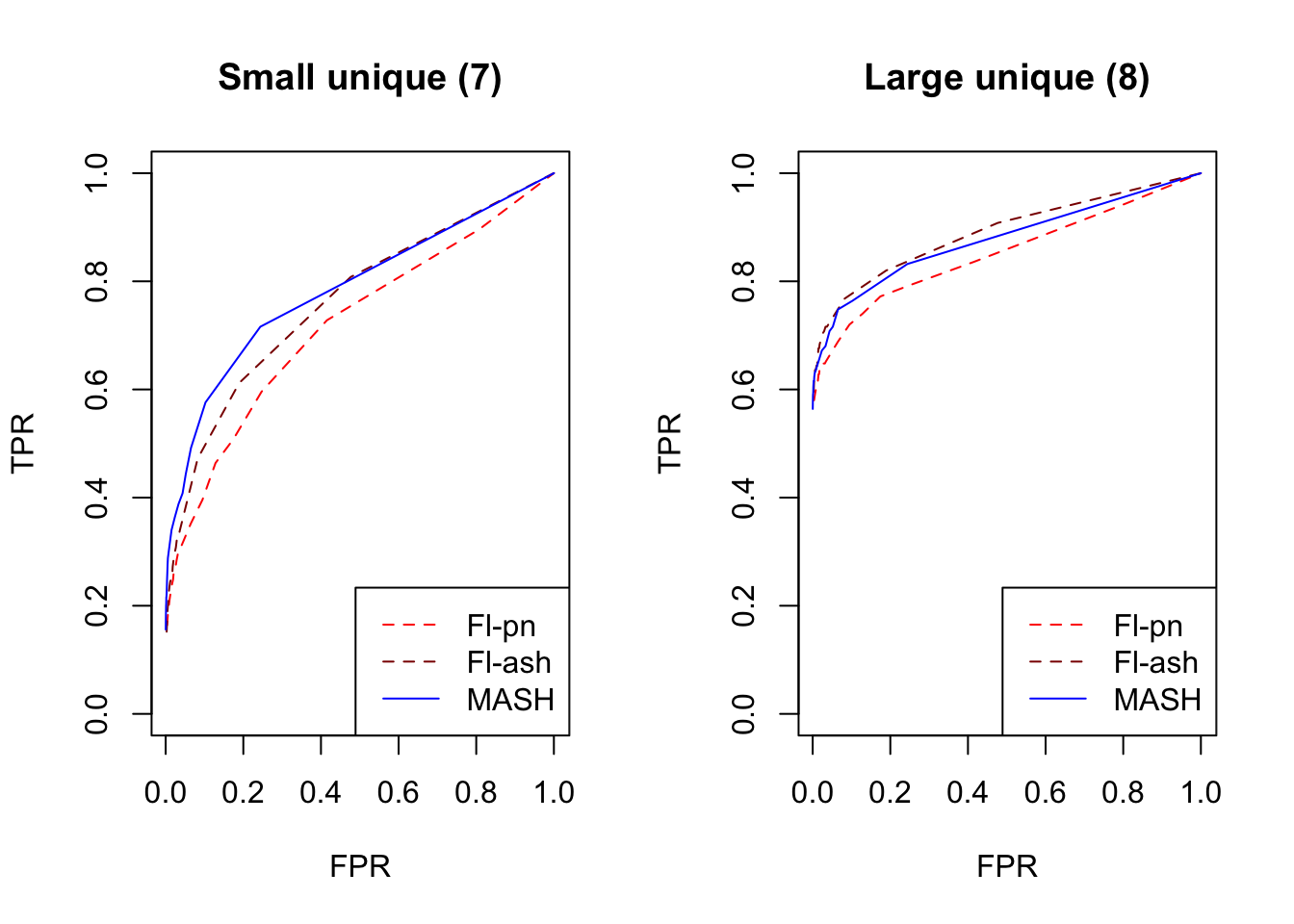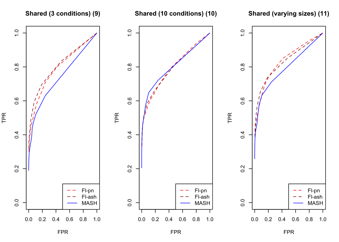 An examination of the ROC curves leads to somewhat different conclusions to the above. As above, MASH does much better with respect to independent effects (types 1-3), random covariance matrices (types 12-14), and a combination of identical and independent effects (type 15), while FLASH outperforms MASH on a combination of identical and unique effects (type 17). Interestingly, point-normal priors outperform ash priors in all of these cases.
