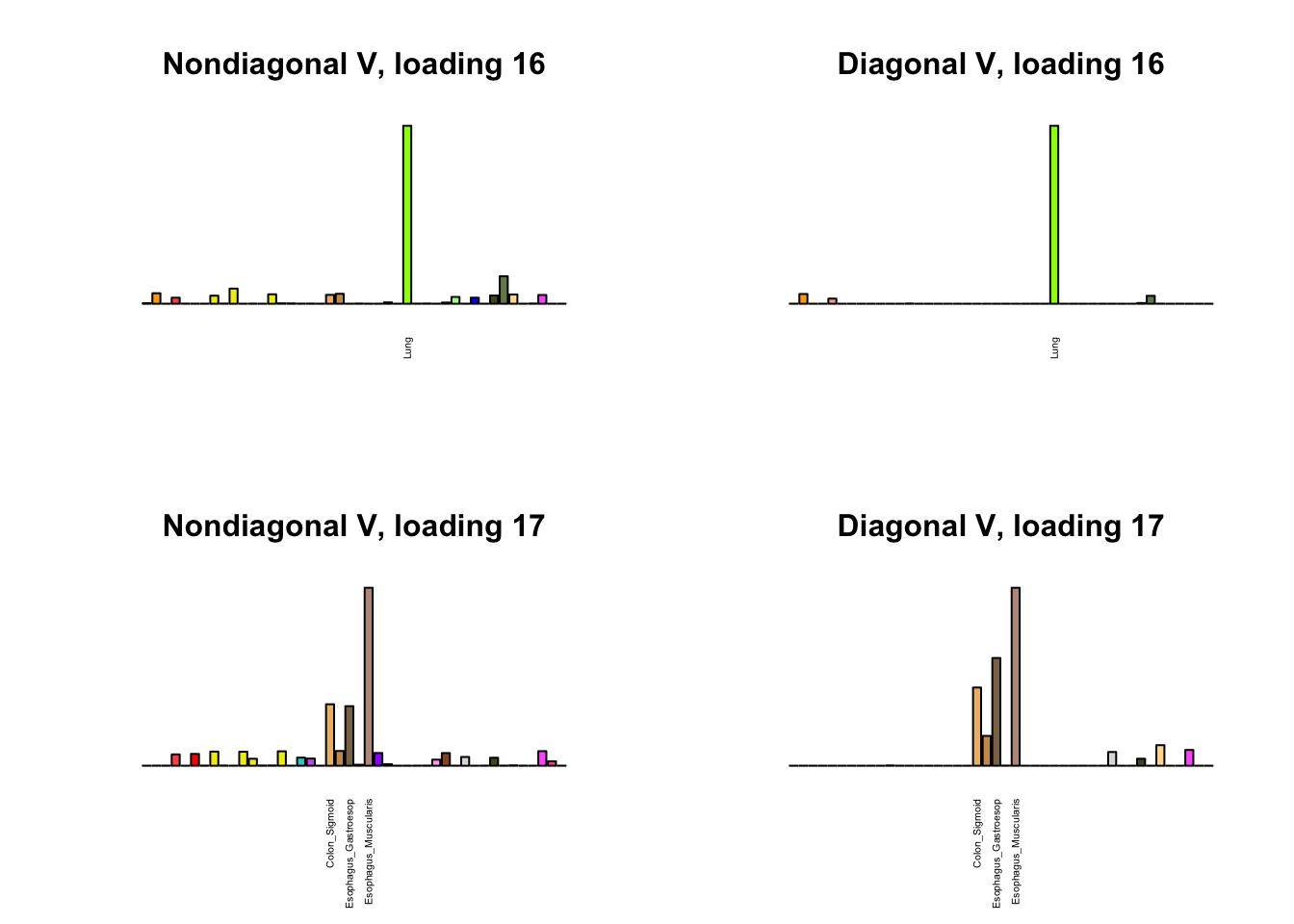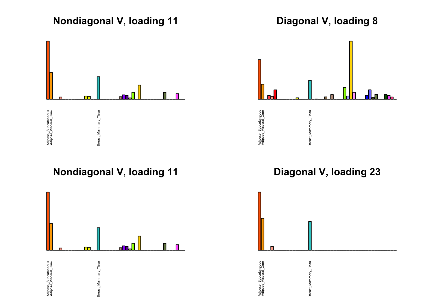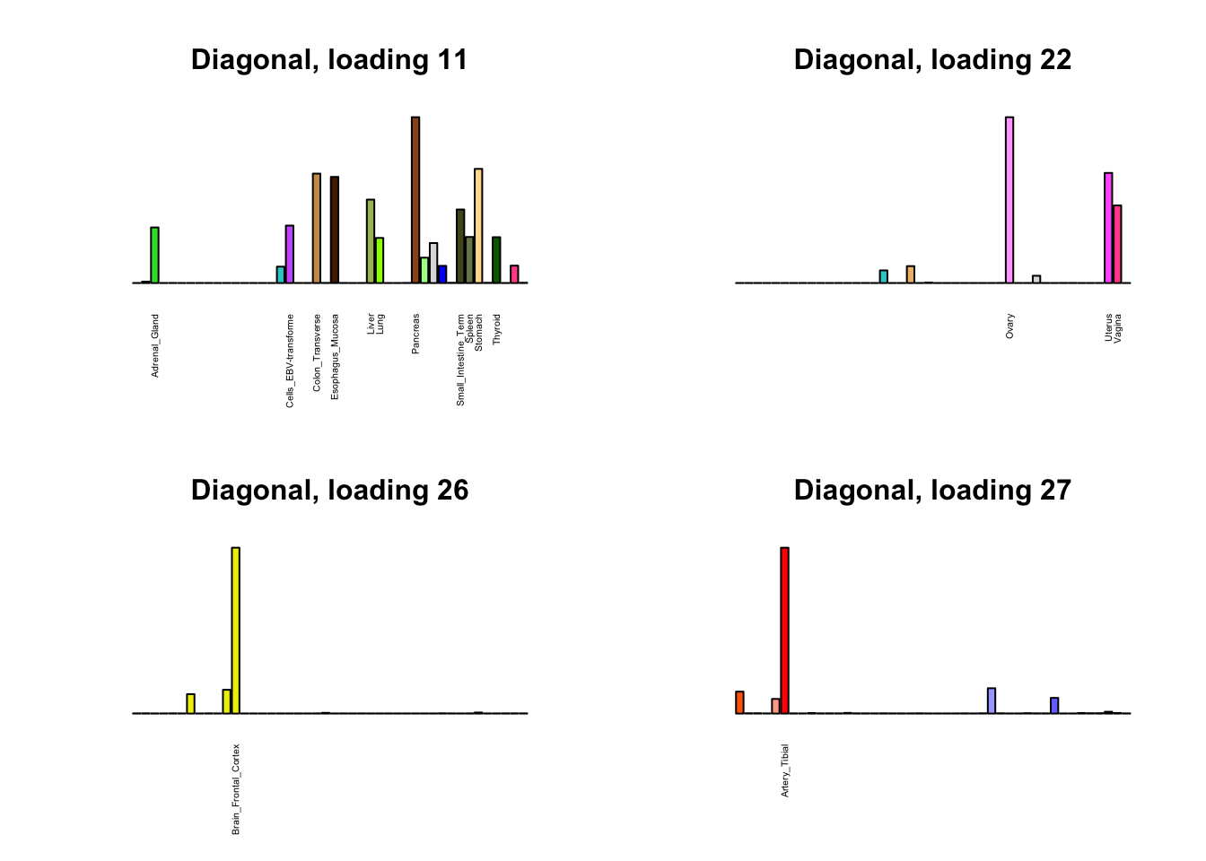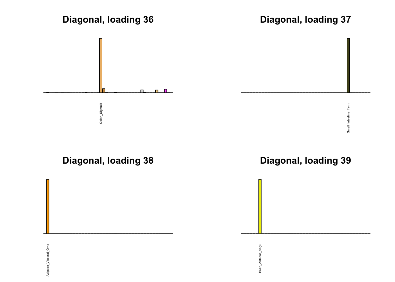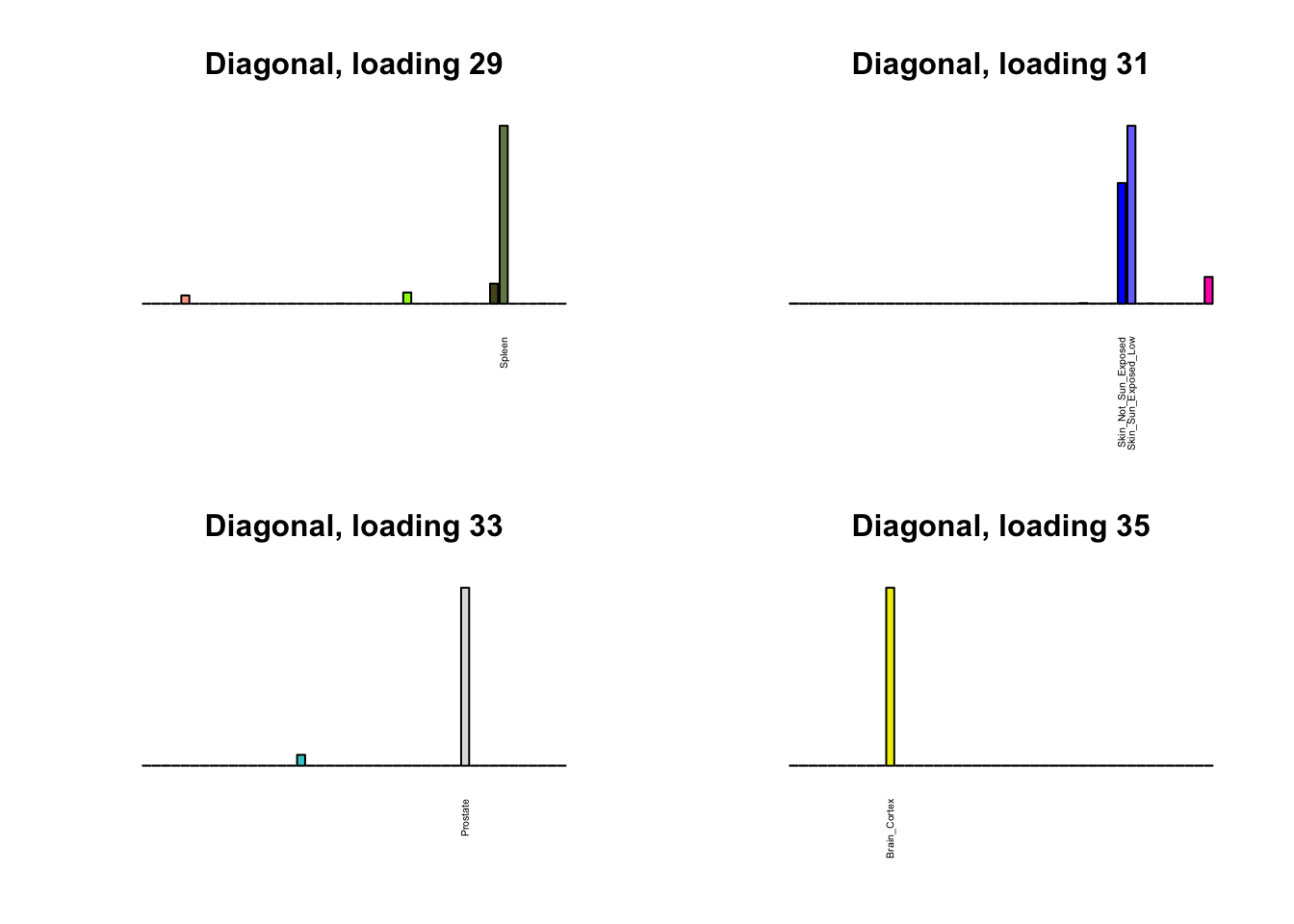 Next, I plot previous loadings that do not correspond to any of the new loadings. One of these (loading 11) may indeed be an artefactual loading that corresponds to covariance in errors rather than biological reality. However, two of the others (loadings 22 and 31) describe very plausible correlations (among ovarian, uterine, and vaginal tissues on the one hand, and among sun-exposed and non-exposed skin tissues on the other). The remaining are unique effects.