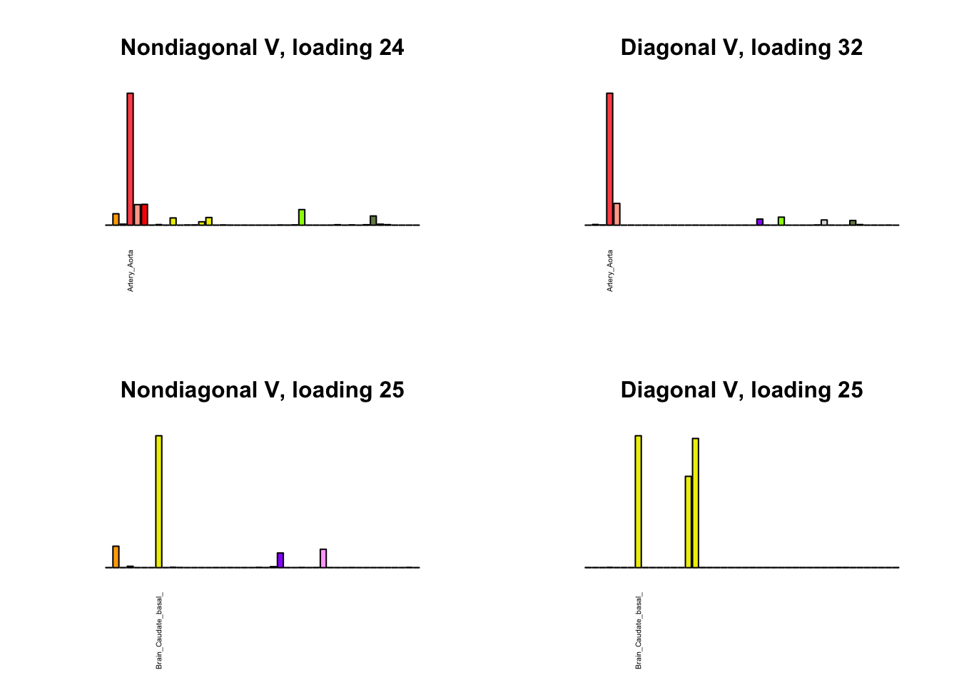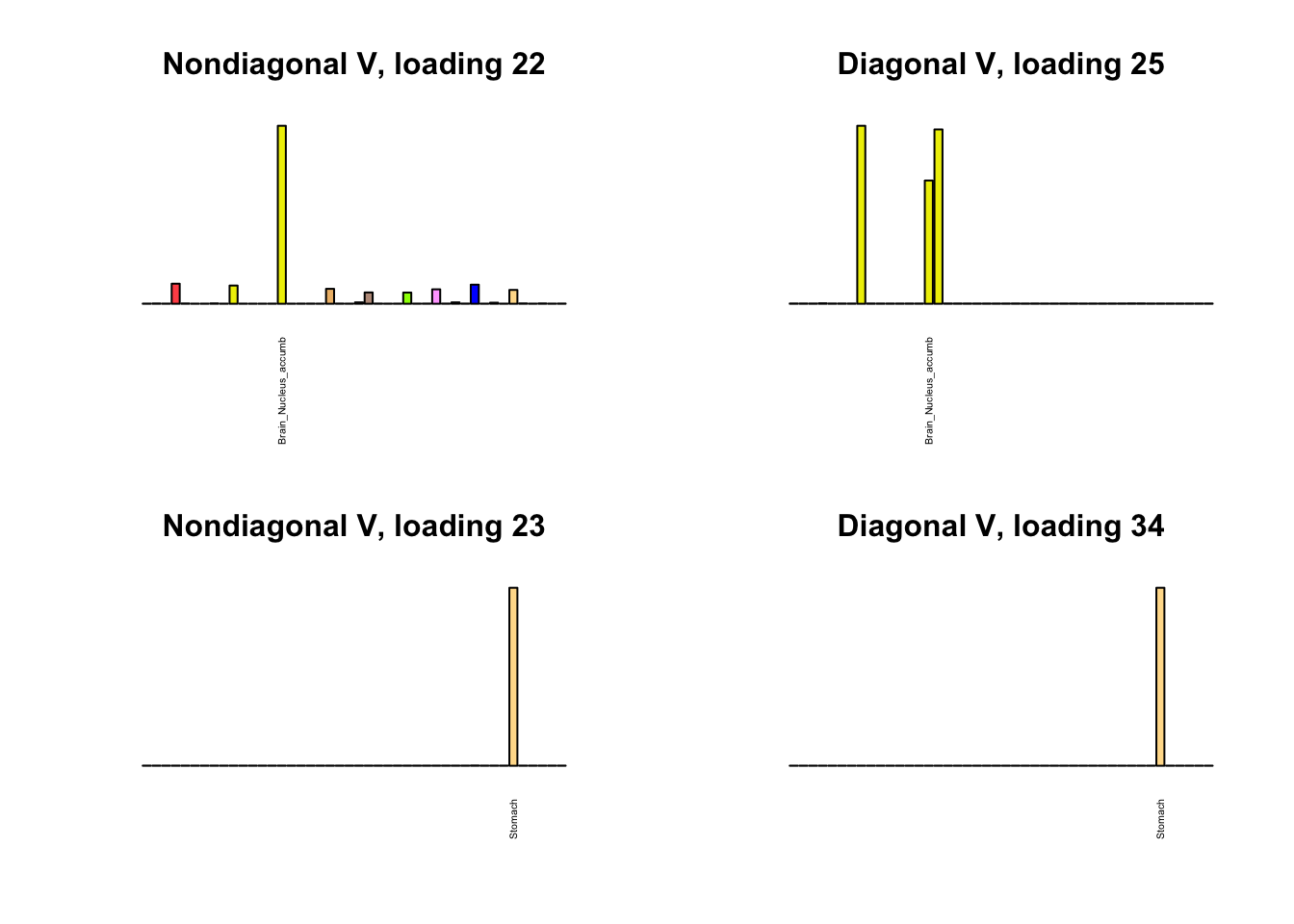 I first plot the new loadings side by side with the previous loadings to which they most closely correspond. Note that, in general, the previous loadings tend to be sparser than these new loadings. Further, this new approach finds two unique effects (caudate basal ganglia and nucleus accumbens basal ganglia) where the previous approach very plausibly found correlations among three types of basal ganglia (loading 25). However, the adipose tissue effects (loading 11) do not get tangled up with the tibial nerve tissue effect (as they did in the previous approach).