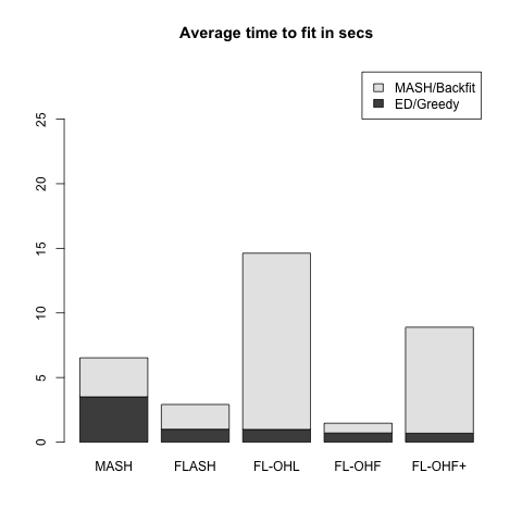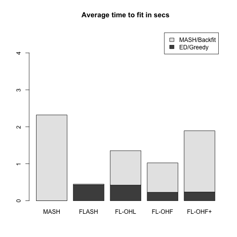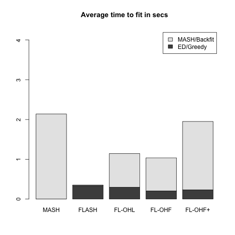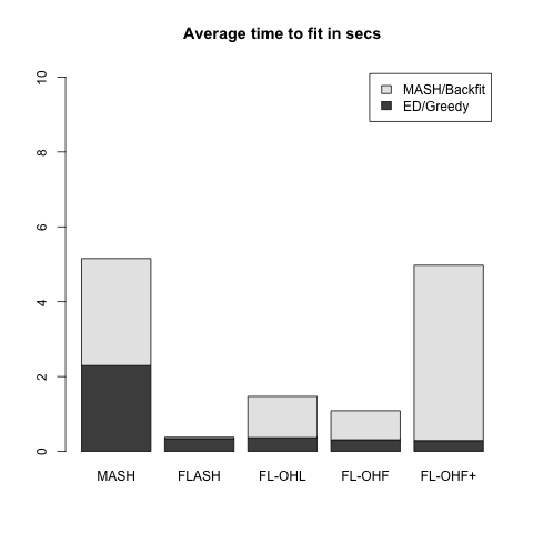 FLASH-OHF (for “one-hots first”) adds the one-hot vectors first, then backfits, then greedily adds up to ten factors. These greedily added factors are not subsequently backfit, so FLASH-OHF can be much faster than FLASH-OHL. FLASH-OHF+ begins with the FLASH-OHF fit and then performs a second backfitting.