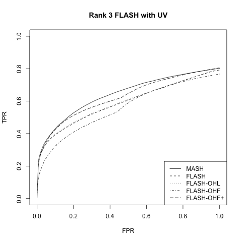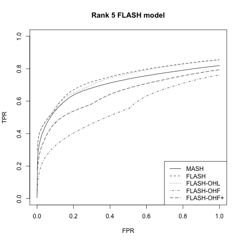 Without the one-hot vectors, the Vanilla and Zero FLASH fits perform poorly on the MASH simulations (see the ROC curves below). The other FLASH fits all perform similarly to one another. They are outperformed by MASH, especially at low FPR thresholds, but this is expected since the data are, after all, generated from the MASH model. Of these three FLASH methods, OHF is (as expected) the fastest, and is about twice as fast as the slowest method, OHF+.