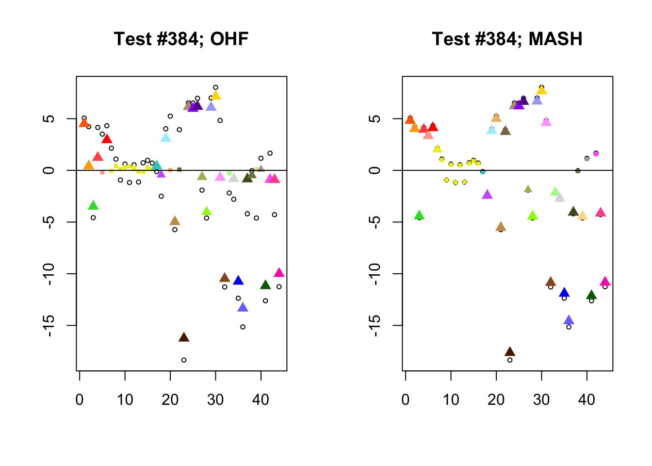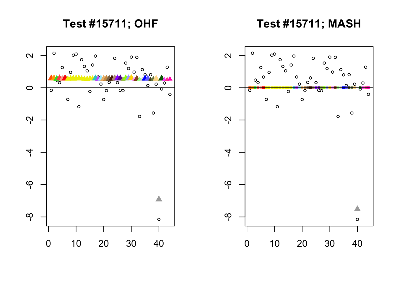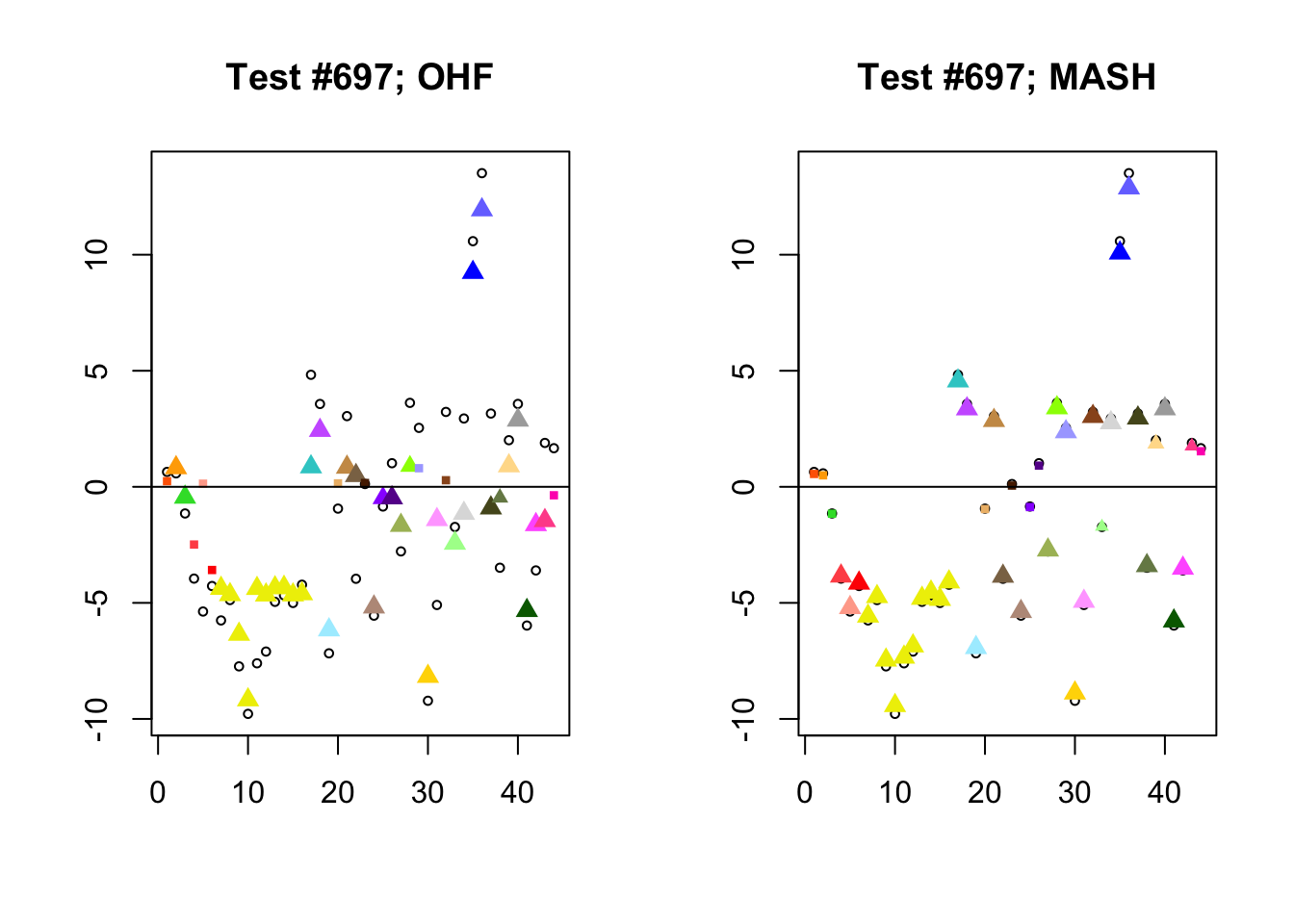 To understand the typical situation where MASH declares effects to be significant but OHF does not, recall from my analysis of GTEx workflows that the MASH fit puts large mixture weights on data-driven covariance matrices (around 0.6 on “ED_tPCA” and 0.25 on “ED_PCA_2”) and a comparatively small weight (around 0.1) on the “equal effects” covariance structure. In contrast, the equal effects loading accounts for about 70% of the variance explained by the OHF fit. This, I think, is why OHF is so much more likely to find an equal effect in the tests above. MASH, on the contrary, is more likely to find a pattern of covariance that derives from the data-driven structures. Notice the similarity of the MASH estimates in the following tests (in the last example, signs are reversed):