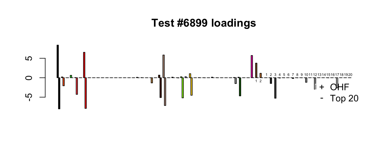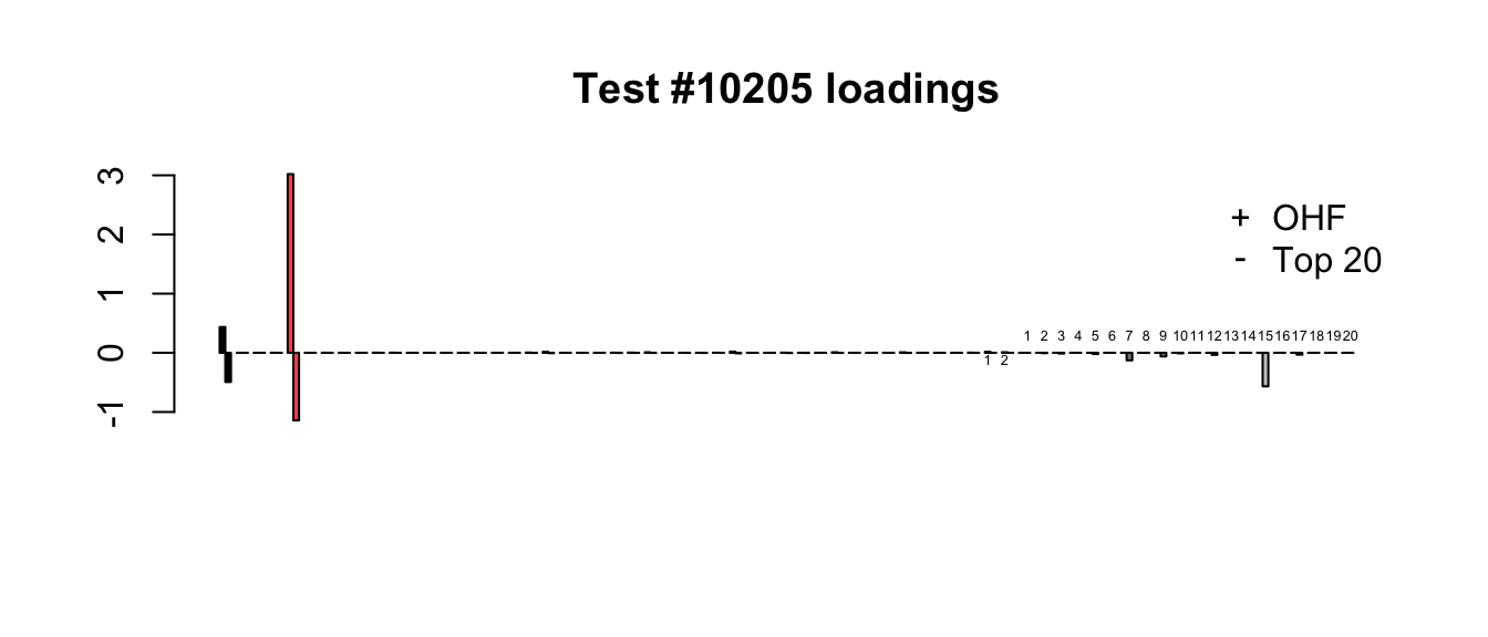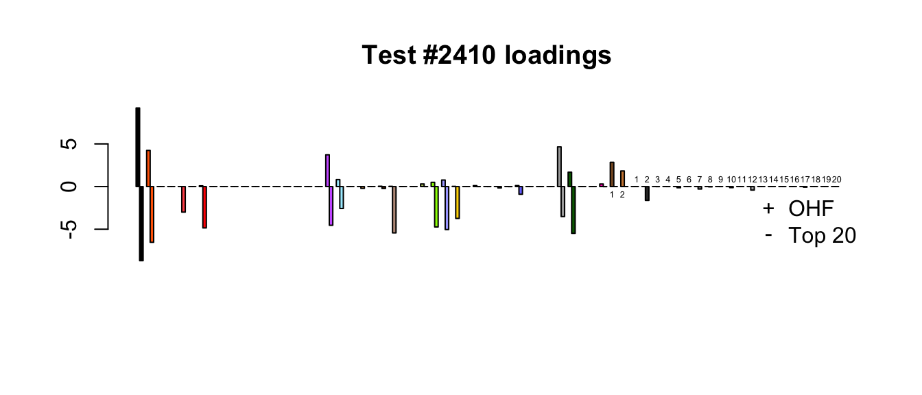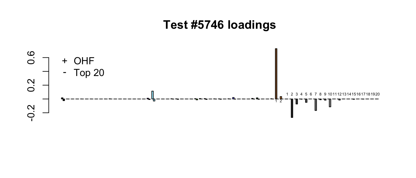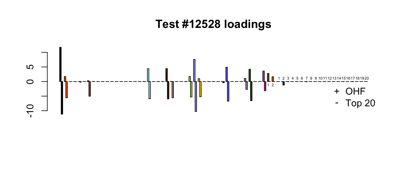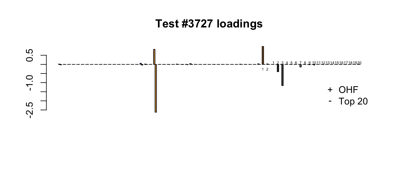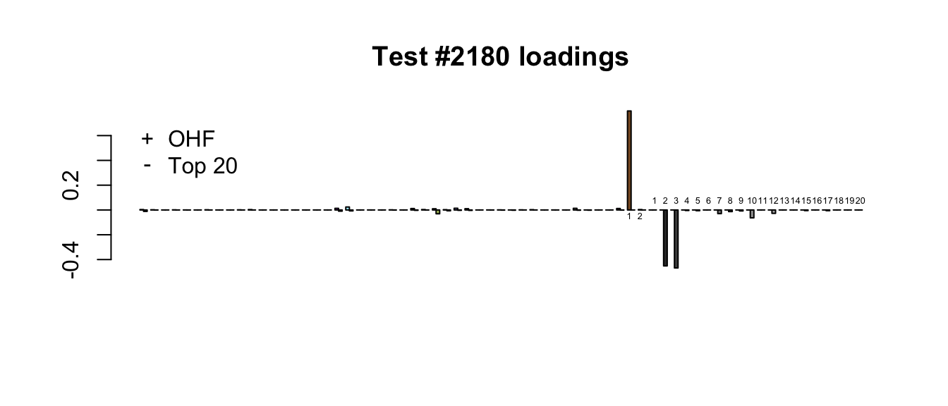 Another consequence of the fact that the OHF fit only has two data-driven loadings is that it will fail to find any patterns that are not prescribed by those loadings. In the following examples, OHF places virtually no weight on its data-driven loadings, whereas the “Top 20” method places moderate to large weights on at least a few data-driven loadings.