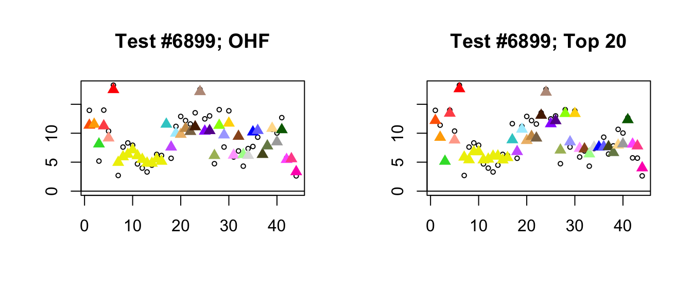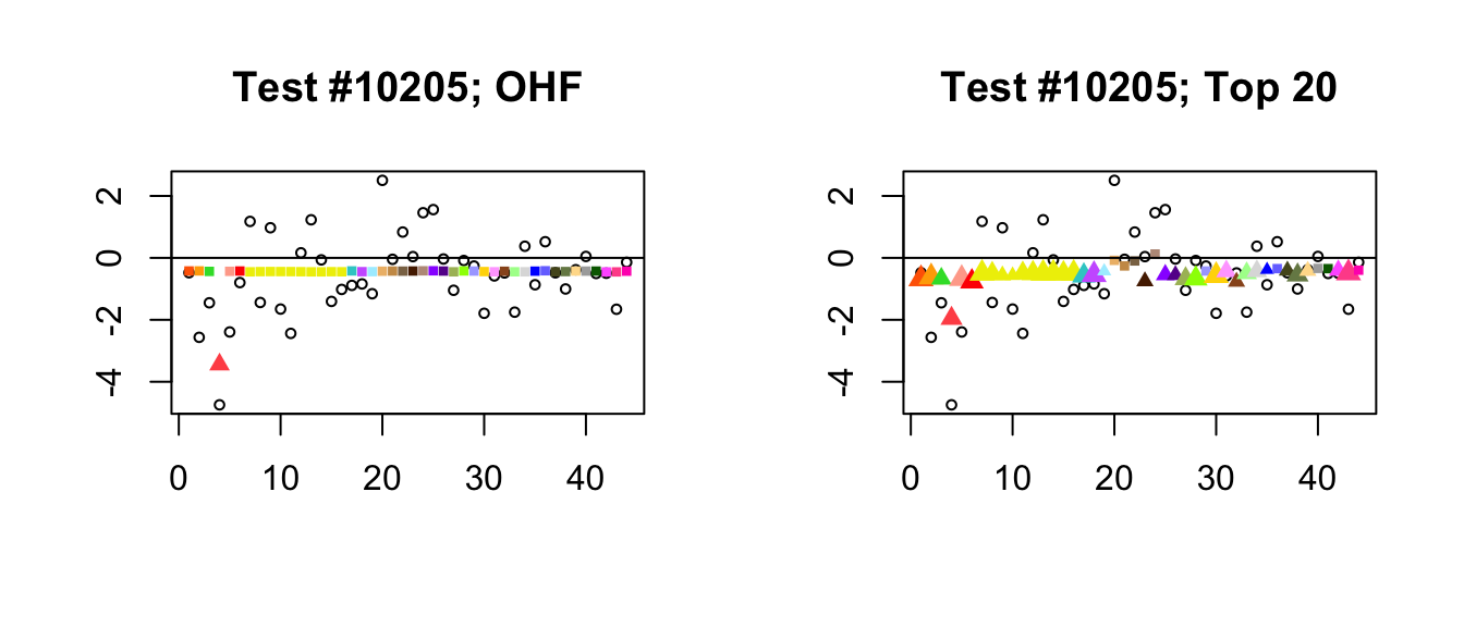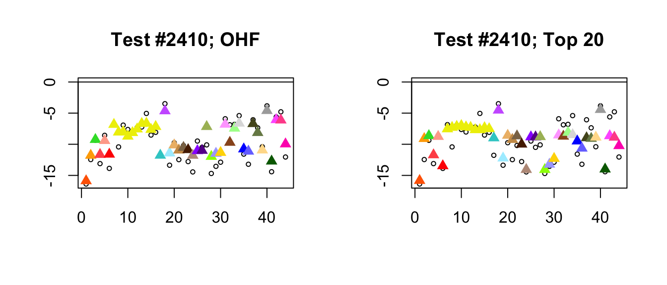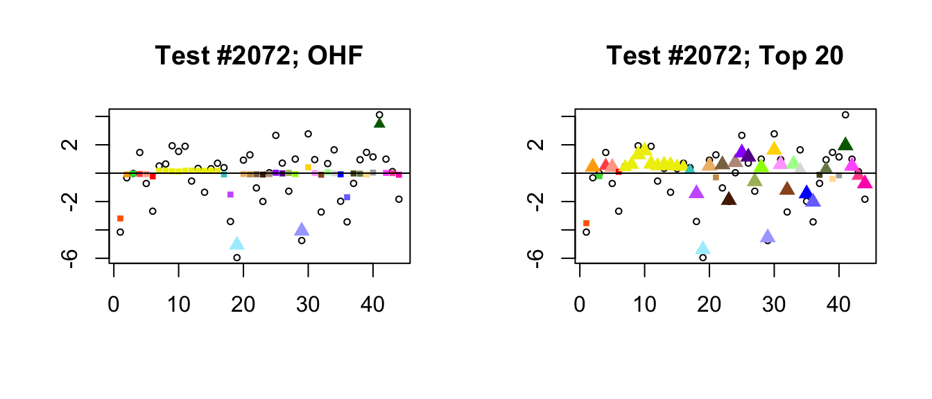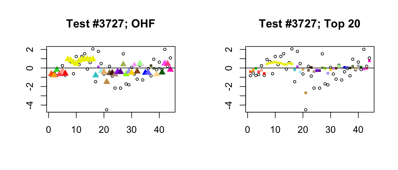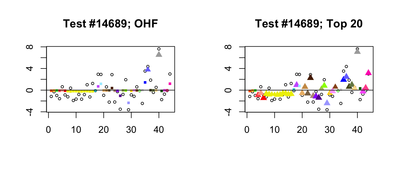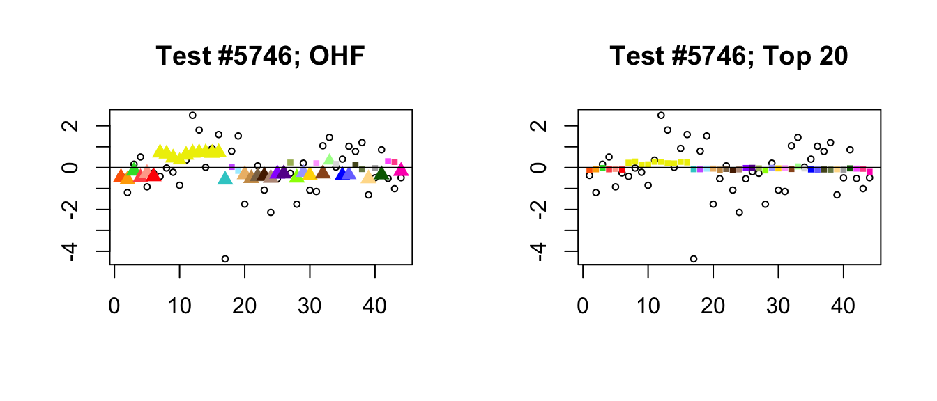Another consequence of the fact that the OHF fit only has two data-driven loadings is that it will fail to find any patterns that are not prescribed by those loadings. In the following examples, OHF places virtually no weight on its data-driven loadings, whereas the “Top 20” method places moderate to large weights on at least a few data-driven loadings.