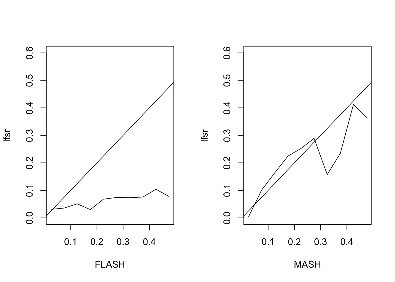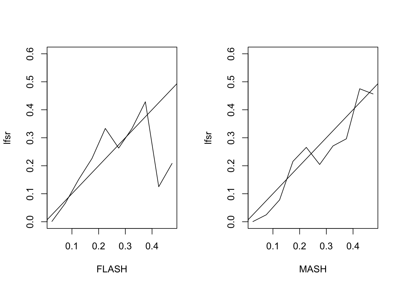 The MSE of the FLASH fit is 0.56, vs. 0.43 for the MASH fit. The proportion of 95% confidence intervals that contain the true value is 0.9 for FLASH and 0.94 for MASH. The true false sign rate vs lfsr appears as follows: