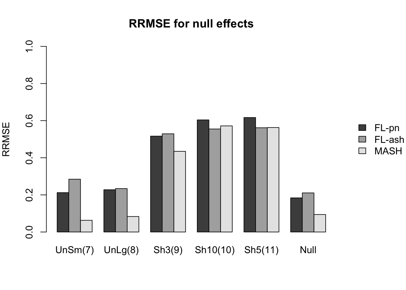 Results for other covariance types are more varied: MASH appears to do better on identical effects (types 4-5, whose covariance structures are included as “canonical”), but slightly worse on rank-one effects (type 6, which is not accounted for by canonical covariance matrices). FLASH seems to outperform MASH on shared effects (types 9-11), but (somewhat surprisingly) MASH does better on random covariance matrices and on combinations involving independent effects (types 12-16), with an RRMSE near 1 (whereas FLASH is again outperformed by the naive estimate \(\hat{X} = Y\)). Finally, FLASH does much better on a combination of identical and unique effects (type 17).