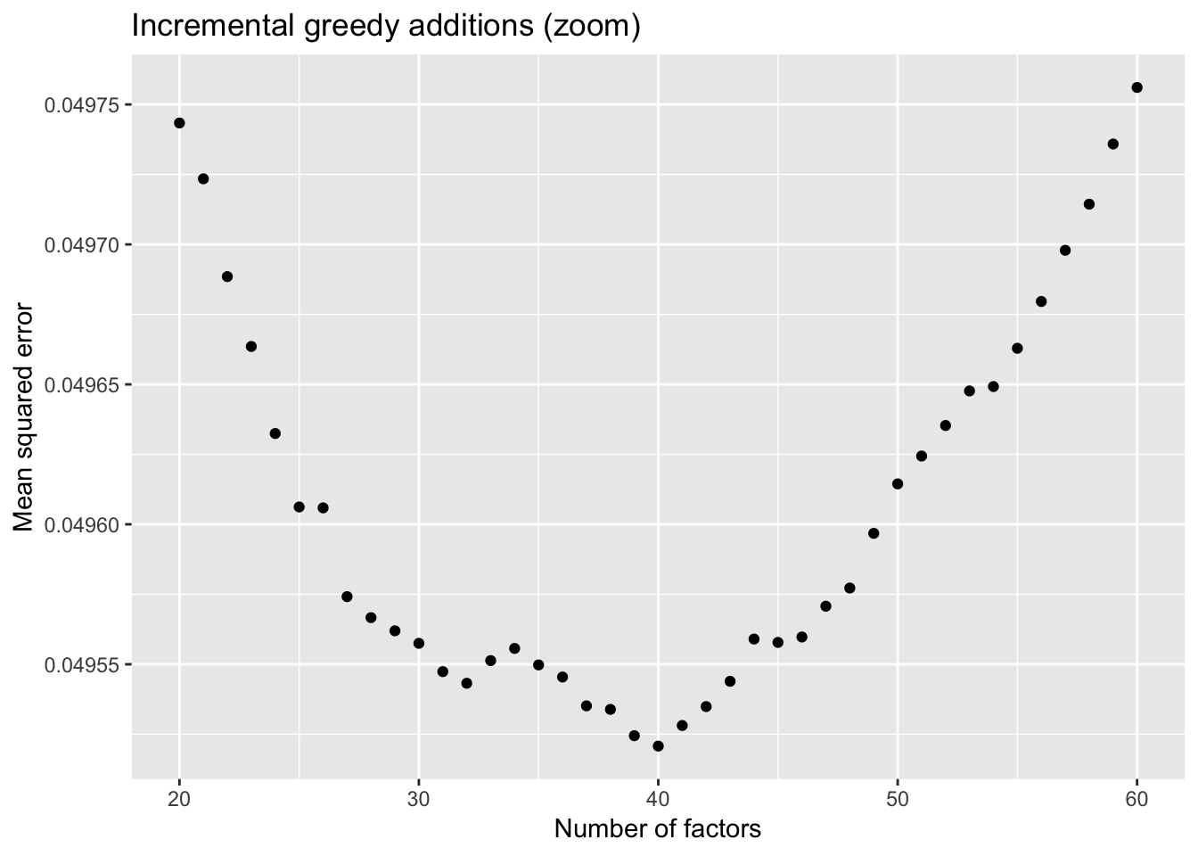Additionally, to paint a more granular picture of how additional factors affect mean squared error, I incrementally fit “greedy” flash objects with 1 to 60 factors using the full drop-seq dataset (not just a subsample of basal cells).