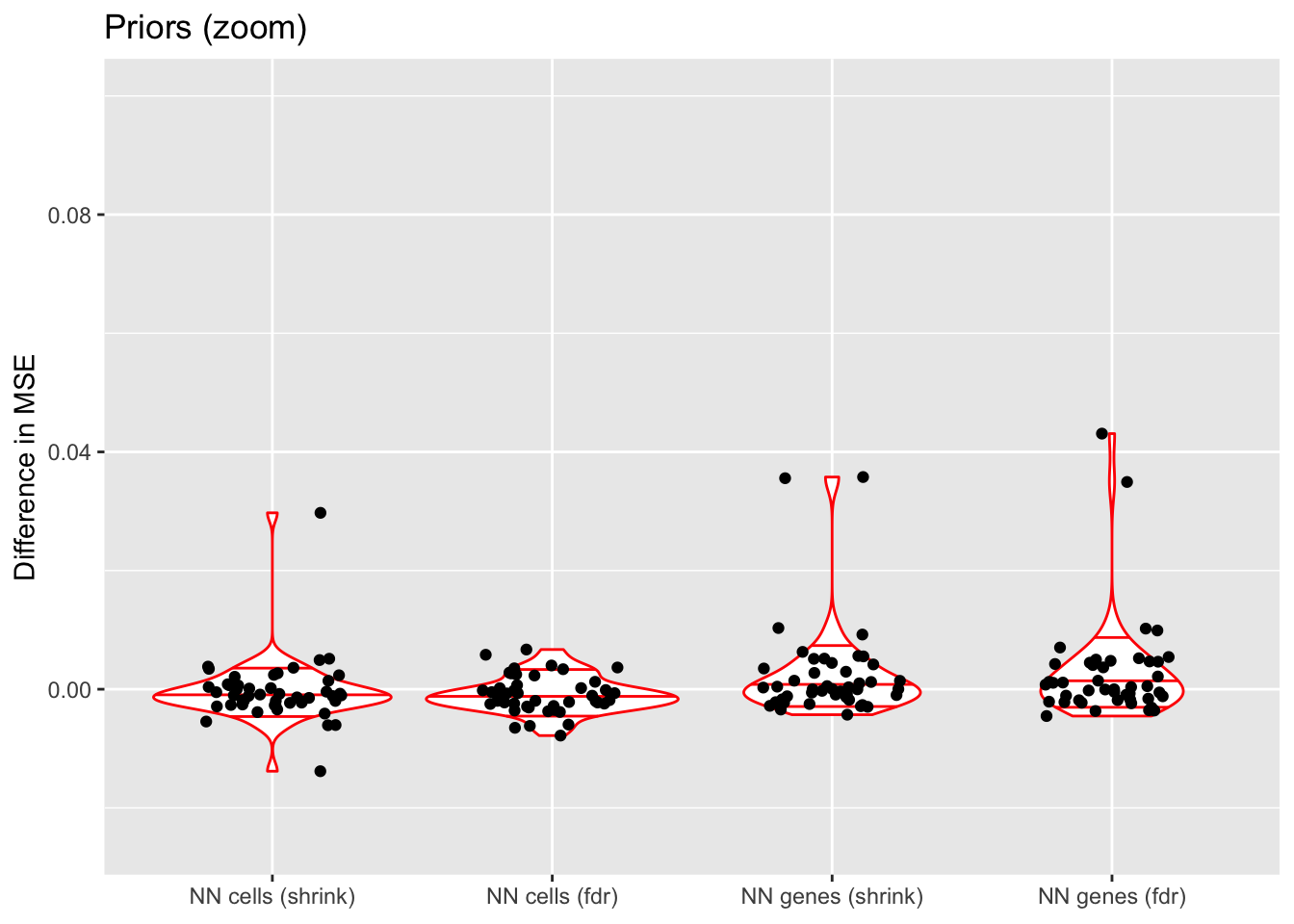 In each case, there is at least one outlying fit that has very poor mean squared error. This problem is much worse when the nonnegative prior is on genes rather than cells. There doesn’t seem to be any consistent difference between method = "fdr" and method = "shrink".