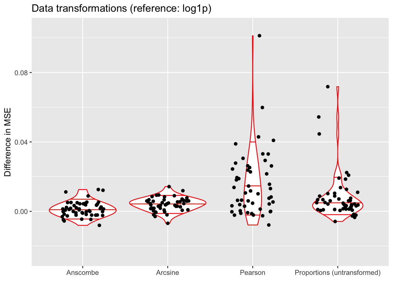 The arcsine transform does worse than either of the two, and (unsurprisingly) fitting the untransformed matrix of proportions does poorly (but maybe not as poorly as expected). Interestingly, fitting the Pearson residuals performs worst among all methods.