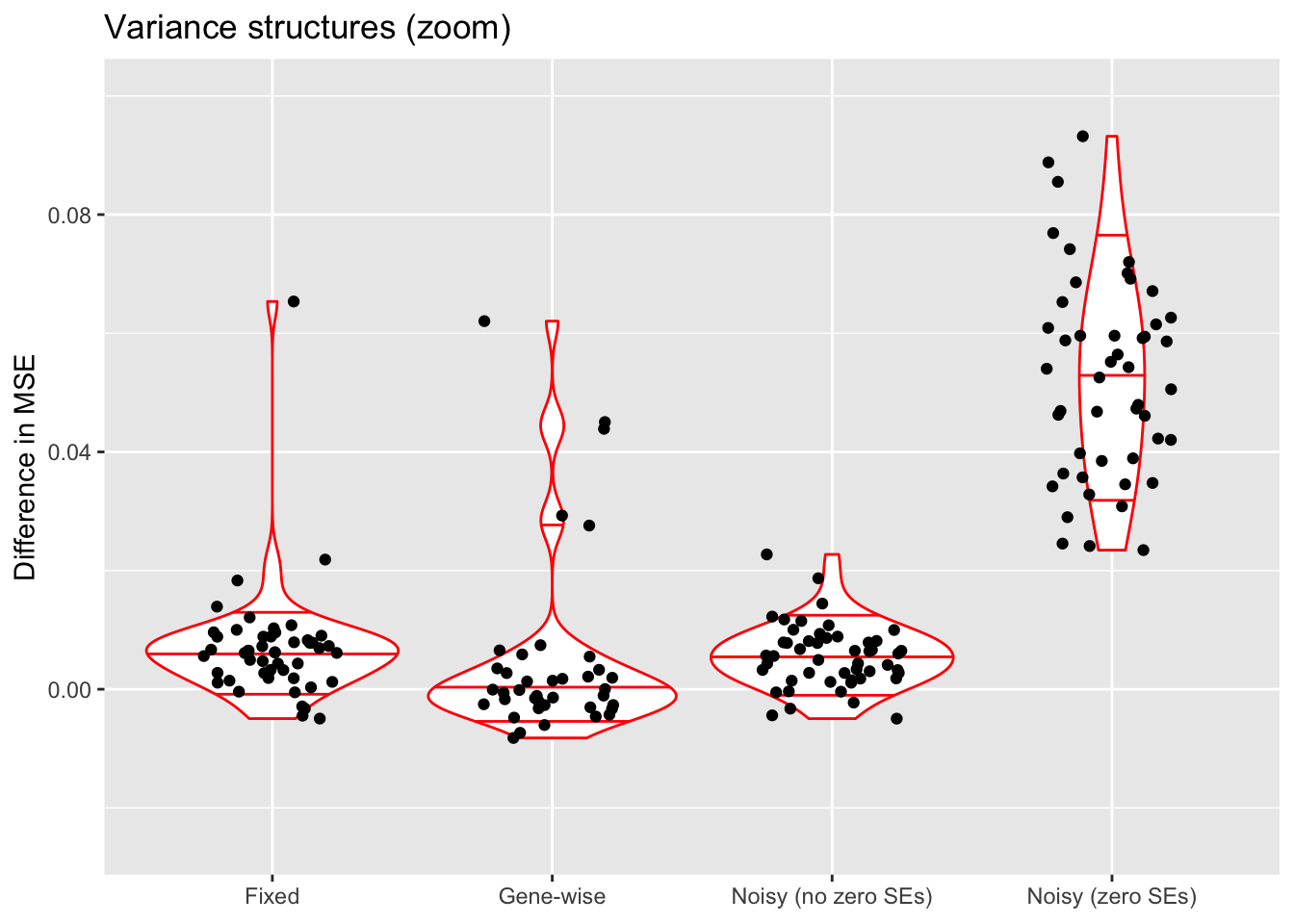 var.df <- create.df(c("constant", "genewise", "fixed", "noisyA", "noisyB"))